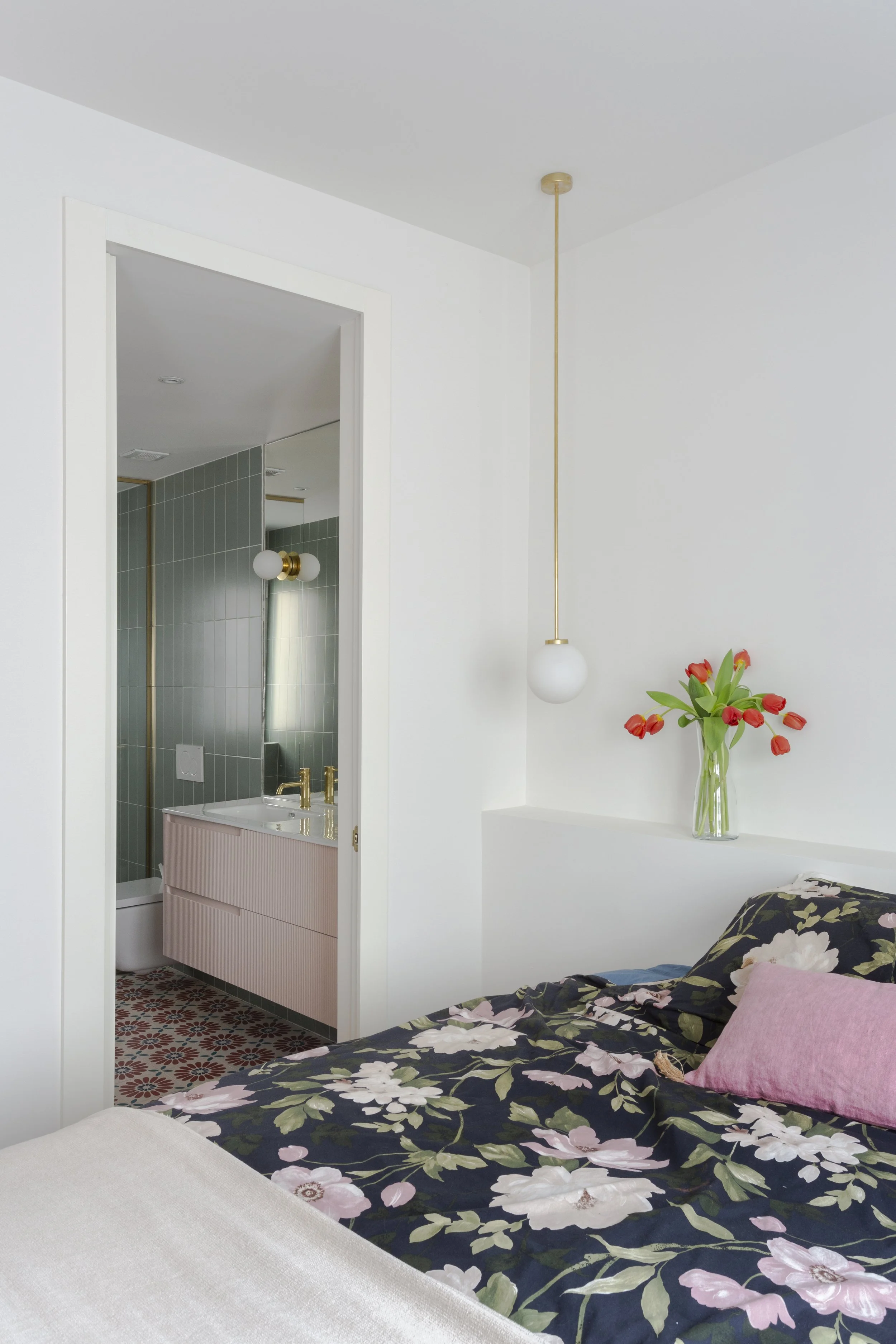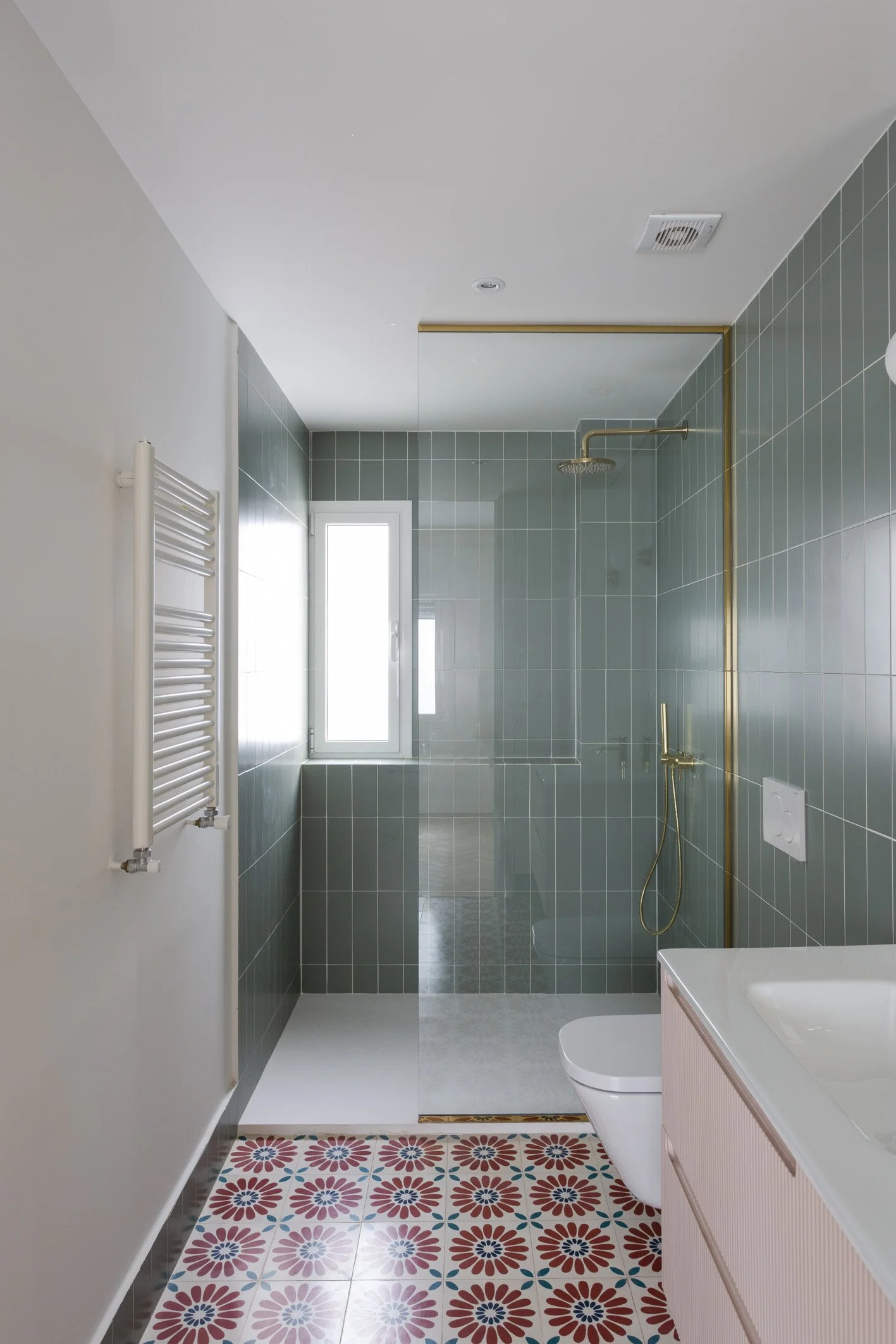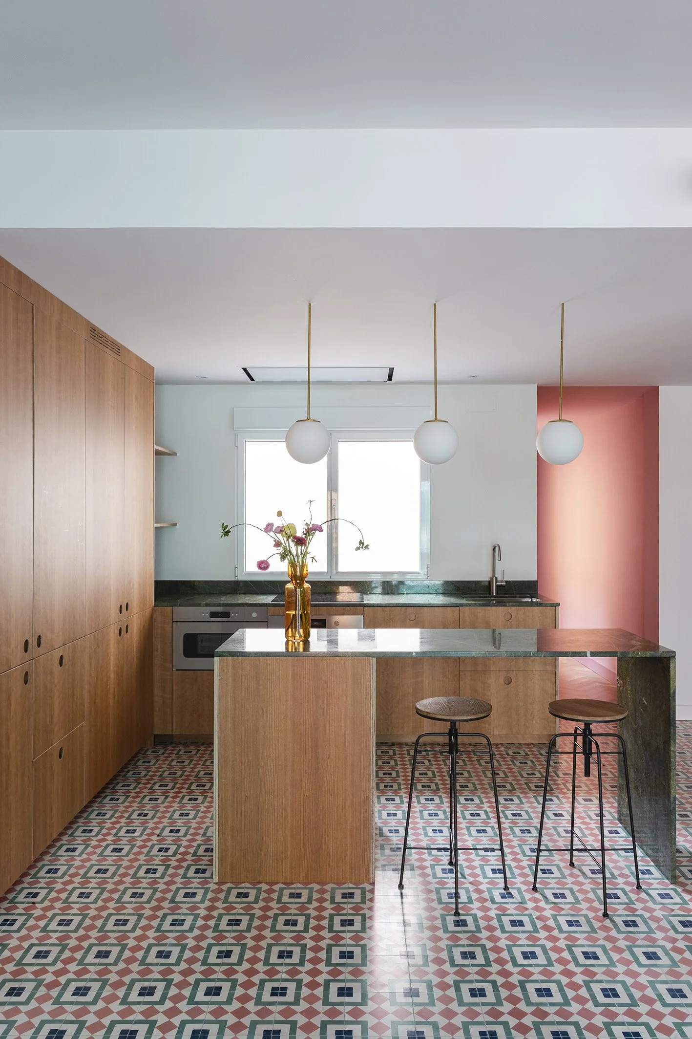 La elección de materiales es algo clave en este proyecto. Se busca un hogar lleno de color y el punto de partida fue la baldosa hidráulica del salón de la casa madrileña Mosaista, con 3 tonalidades que marcan el hilo conductor de todo el proyecto: rosa, azul y verde.