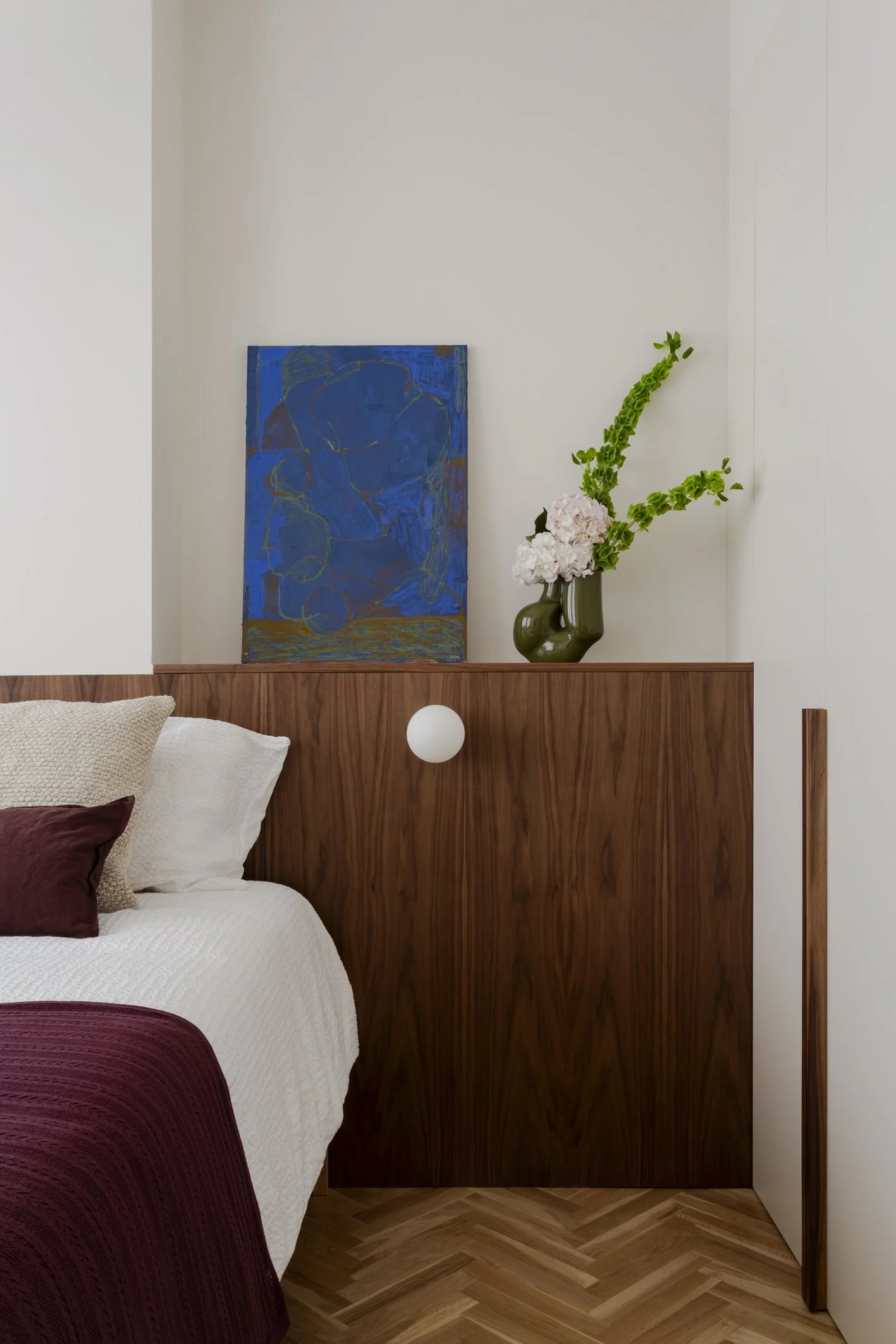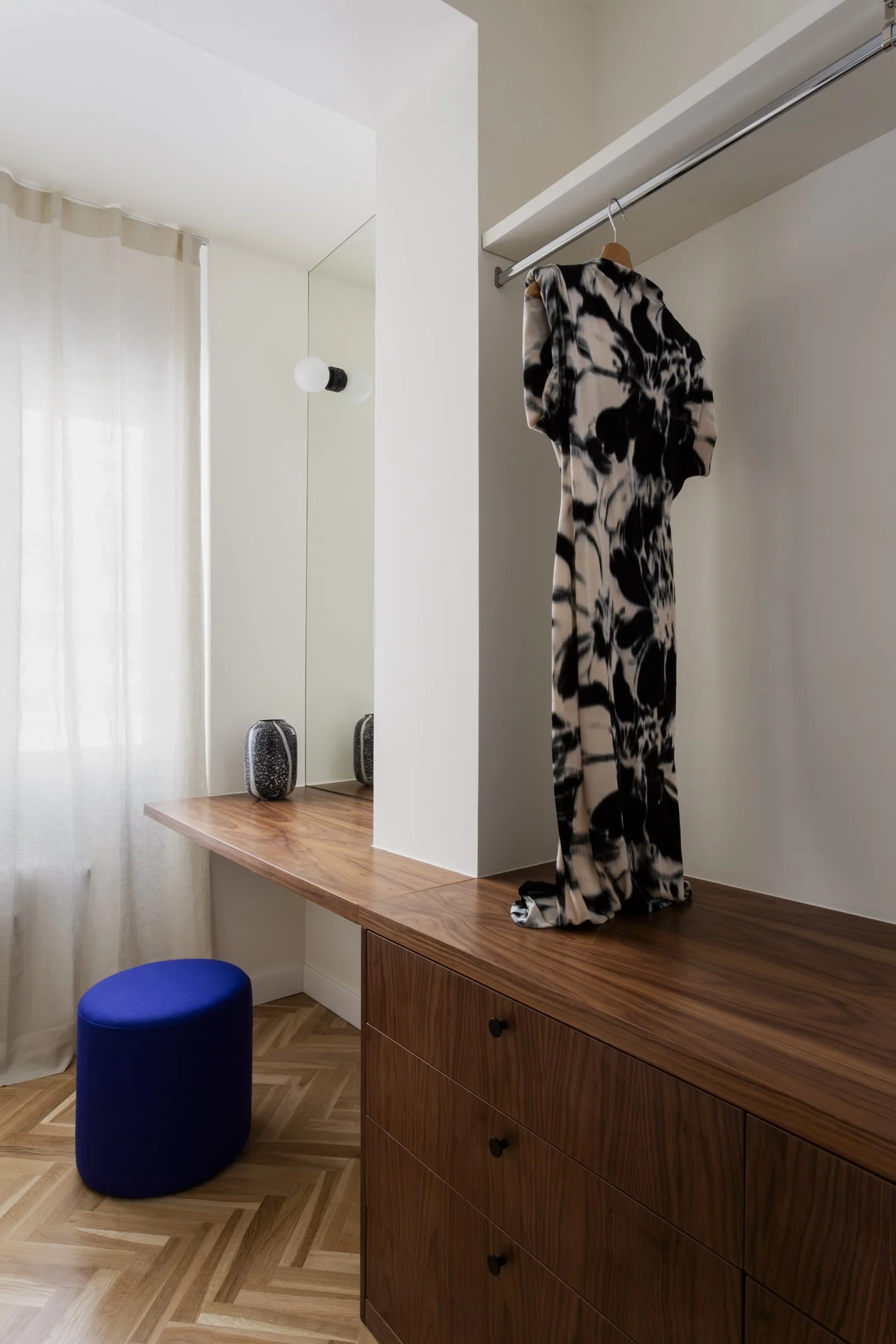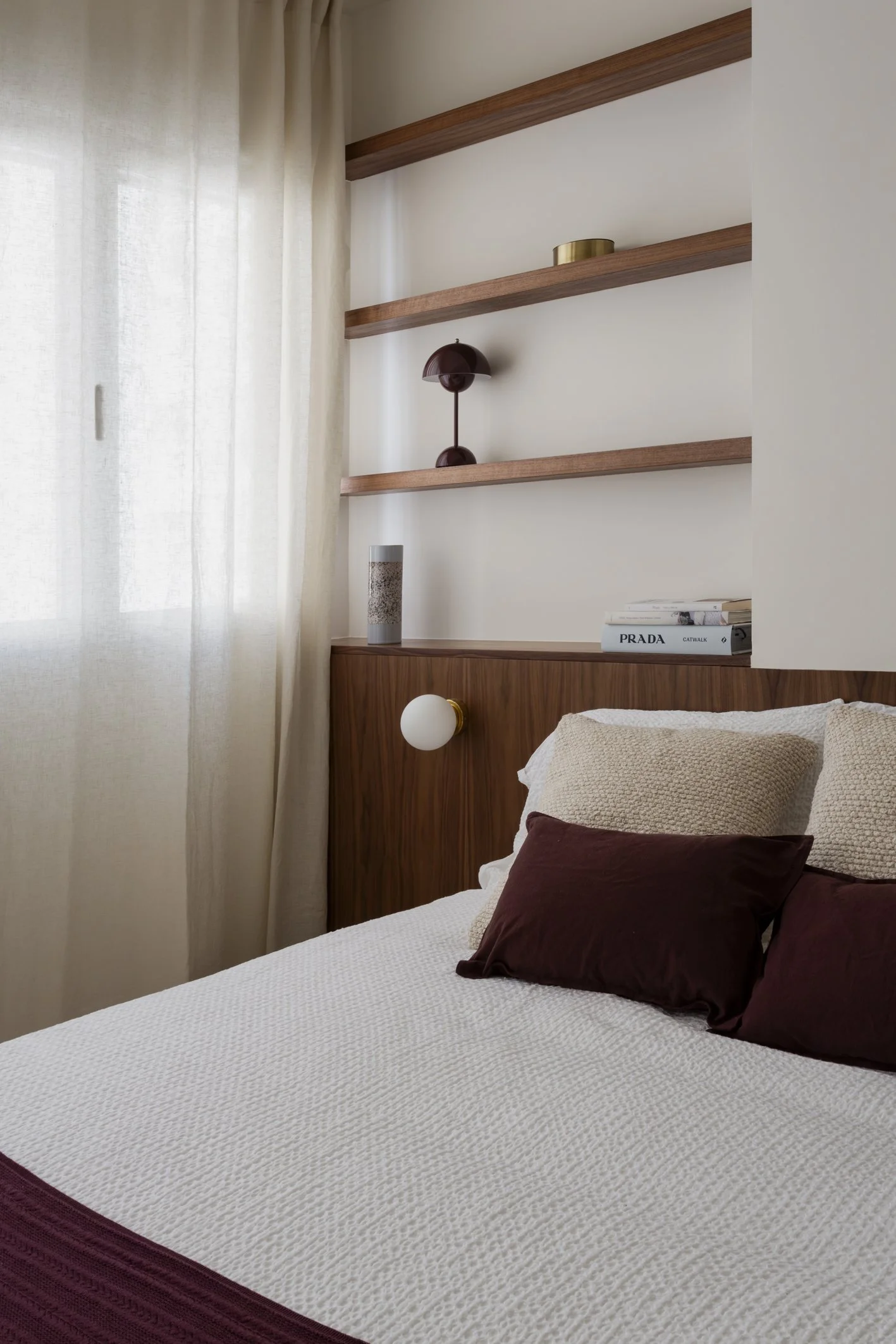 Ambas habitaciones tienen detalles en nogal en los cabeceros llevando también la madera a los planos verticale. También recurrimos a este material para el interior de todo el vestidor dando rotundidad y personalidad a través de los materiales que visten cada espacio.