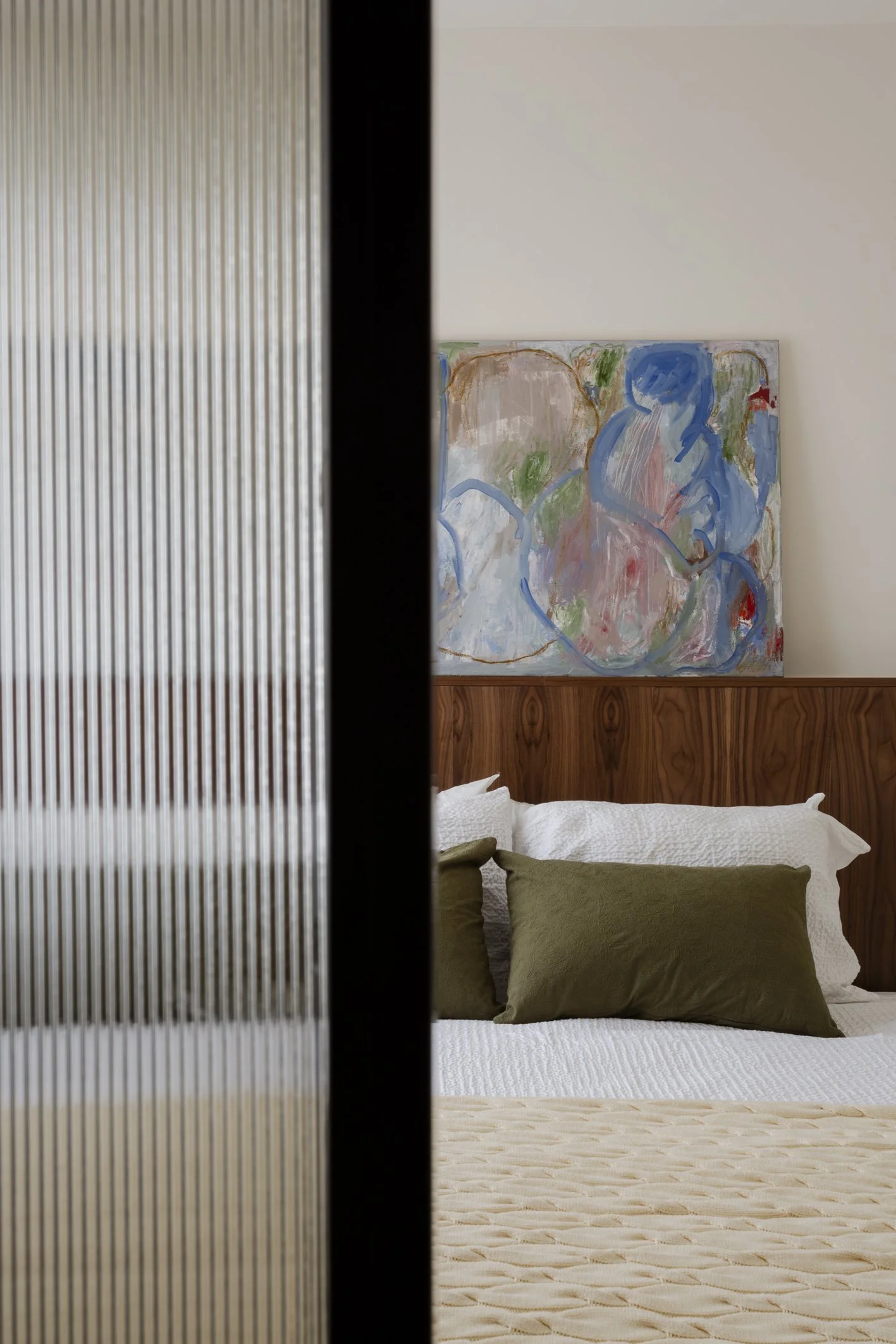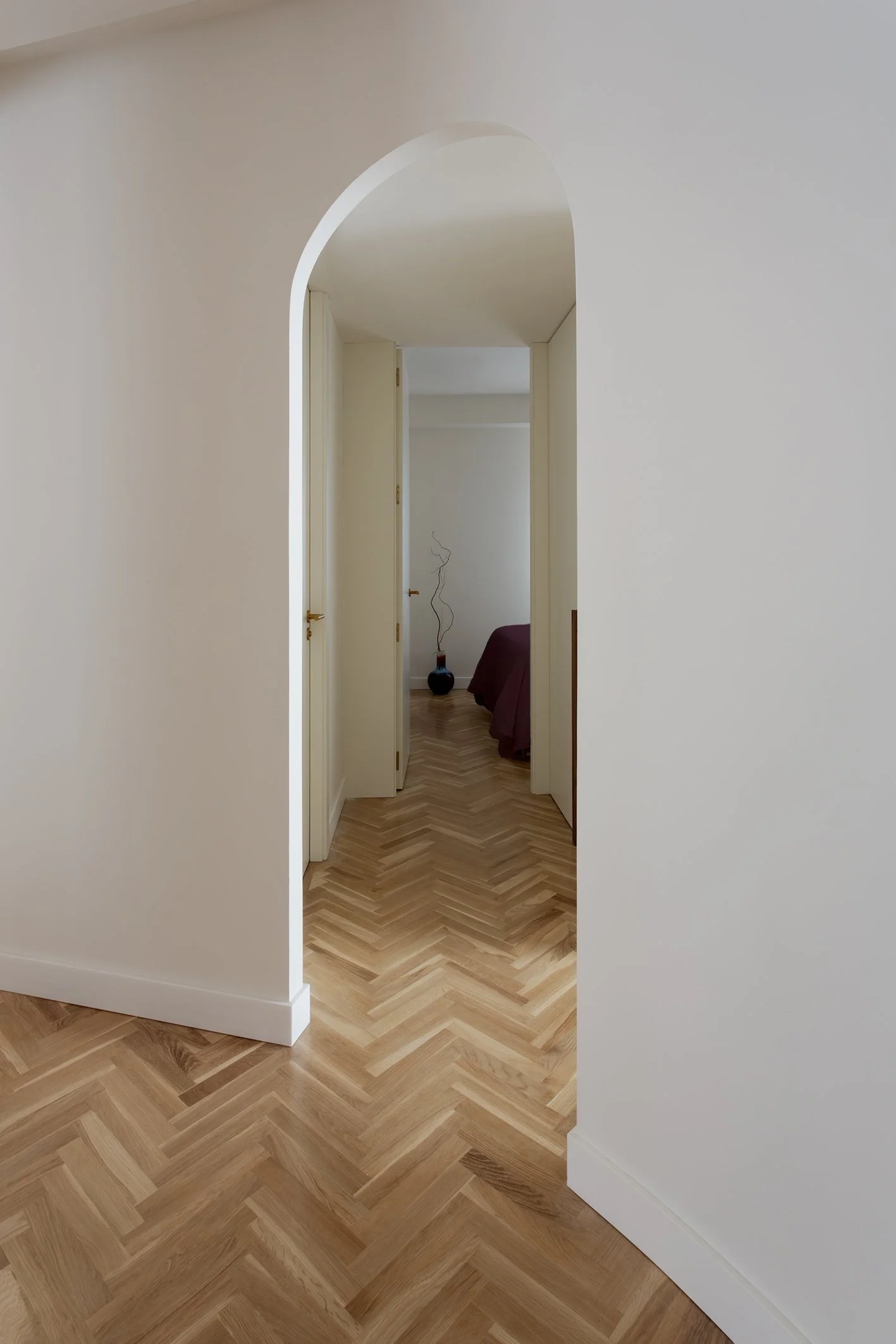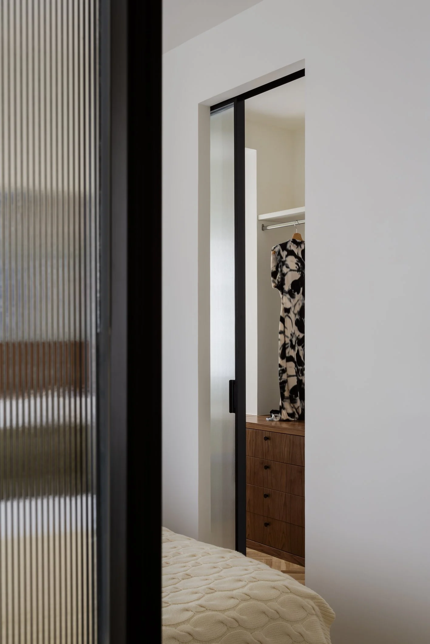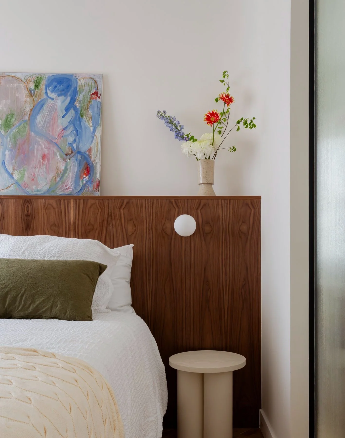 Ambas habitaciones tienen detalles en nogal en los cabeceros llevando también la madera a los planos verticale. También recurrimos a este material para el interior de todo el vestidor dando rotundidad y personalidad a través de los materiales que visten cada espacio.
