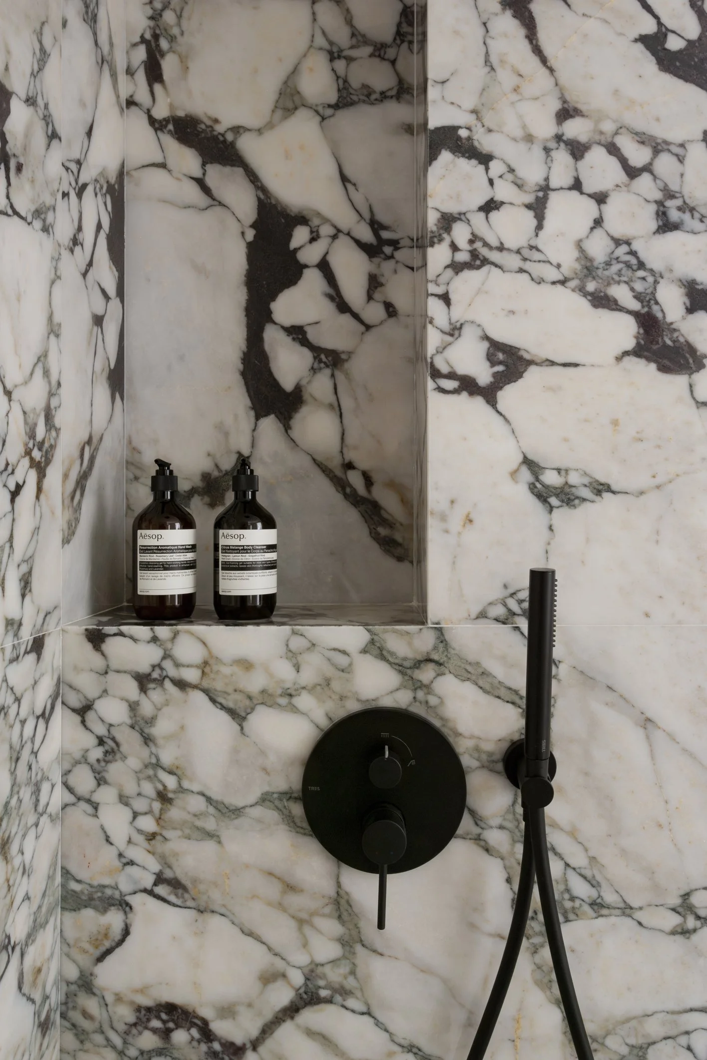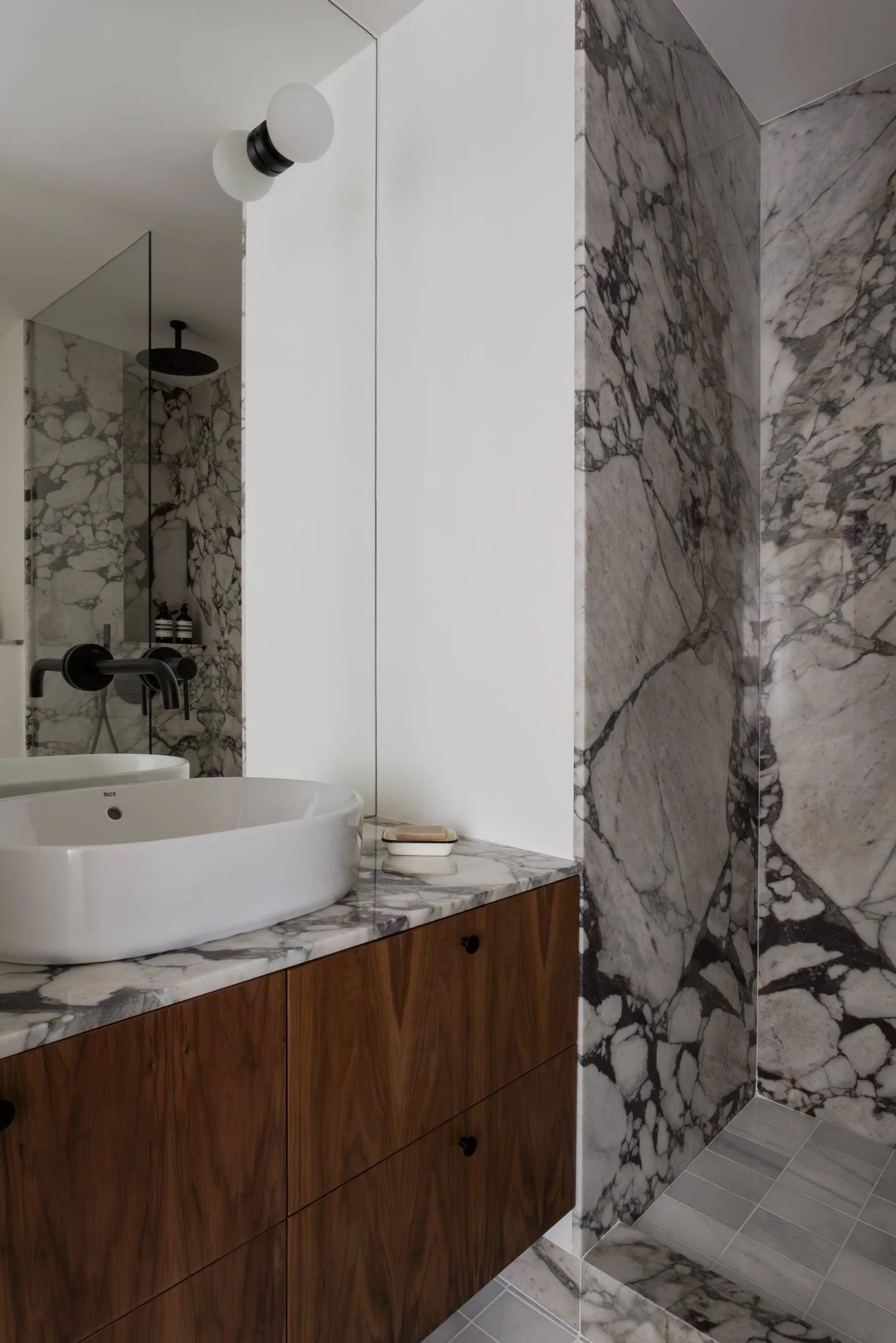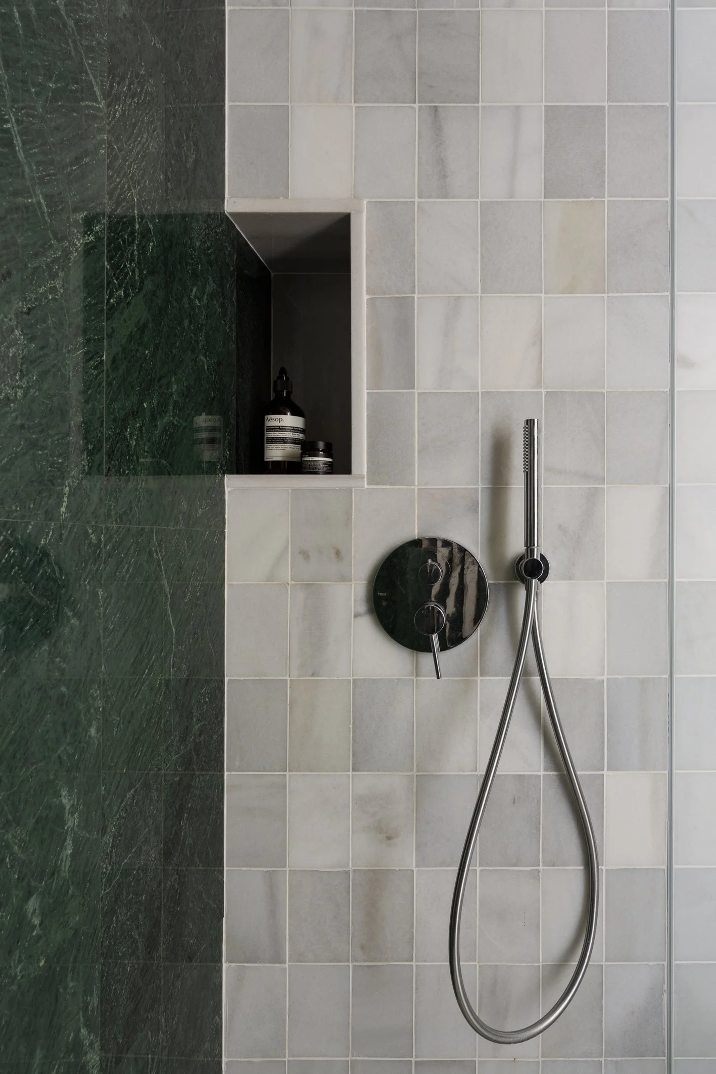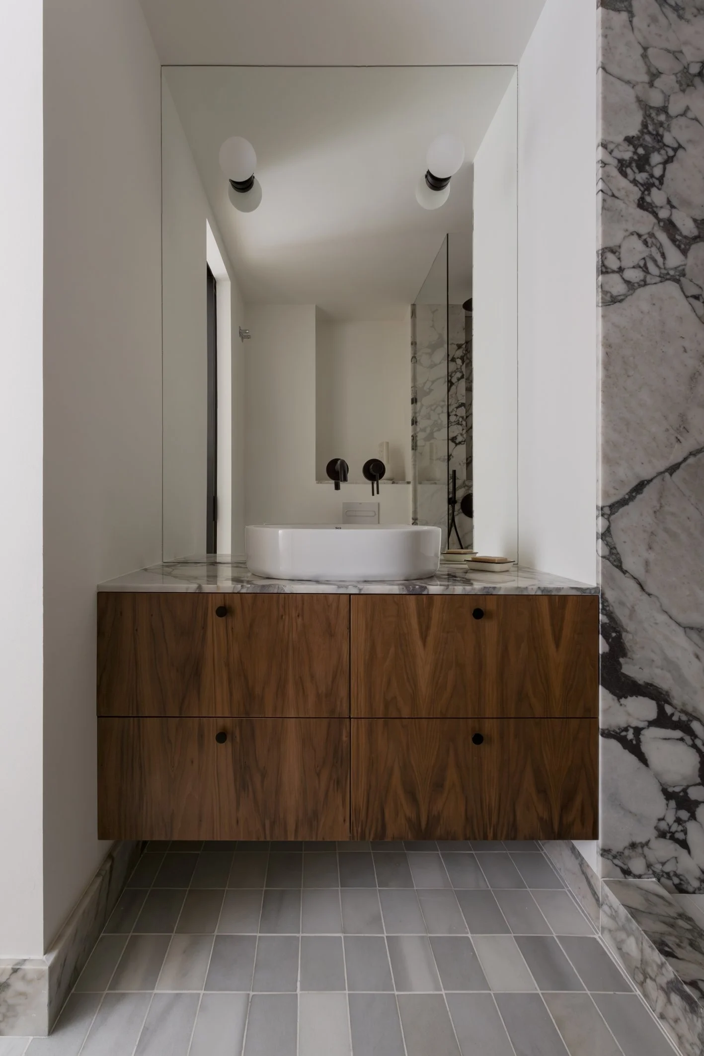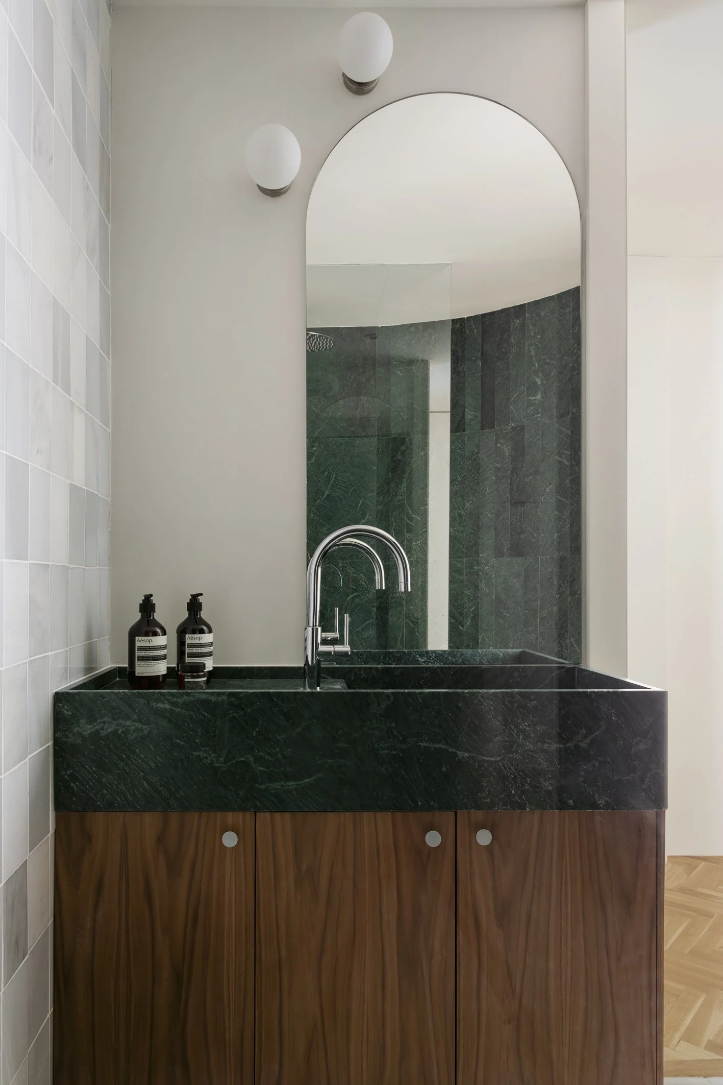 “En el baño de invitados: el mármol Ibiza blanco, en formato pequeño en suelo y pared se convina con el mármol verde india que se adapta a la curva jugando con 2 despieces diferentes, creando movimiento y dinamismo en un espacio único. Aprovechamos el mismo. Material para crear un lavabo a medida que preside un mueble de nogal. ”