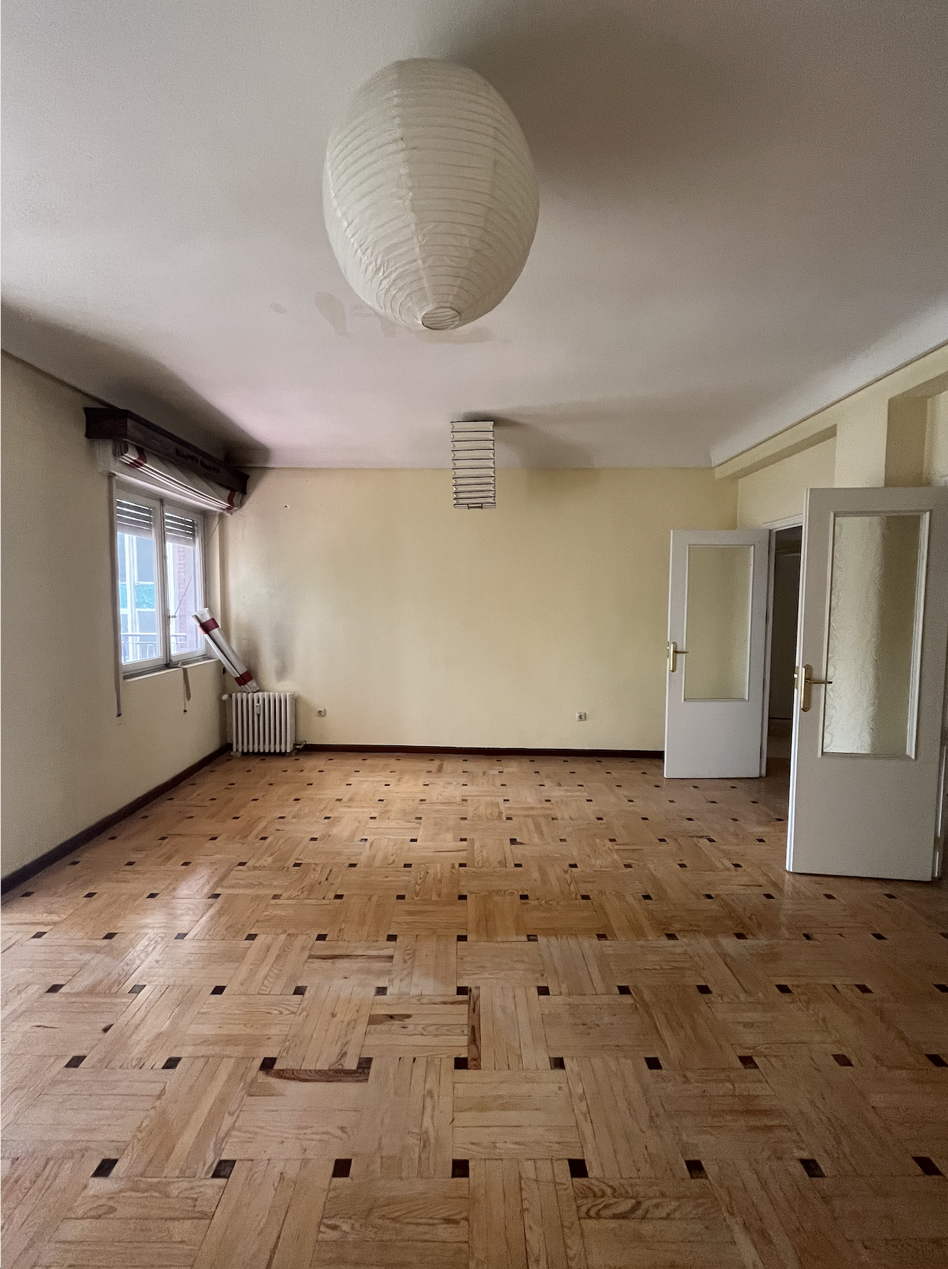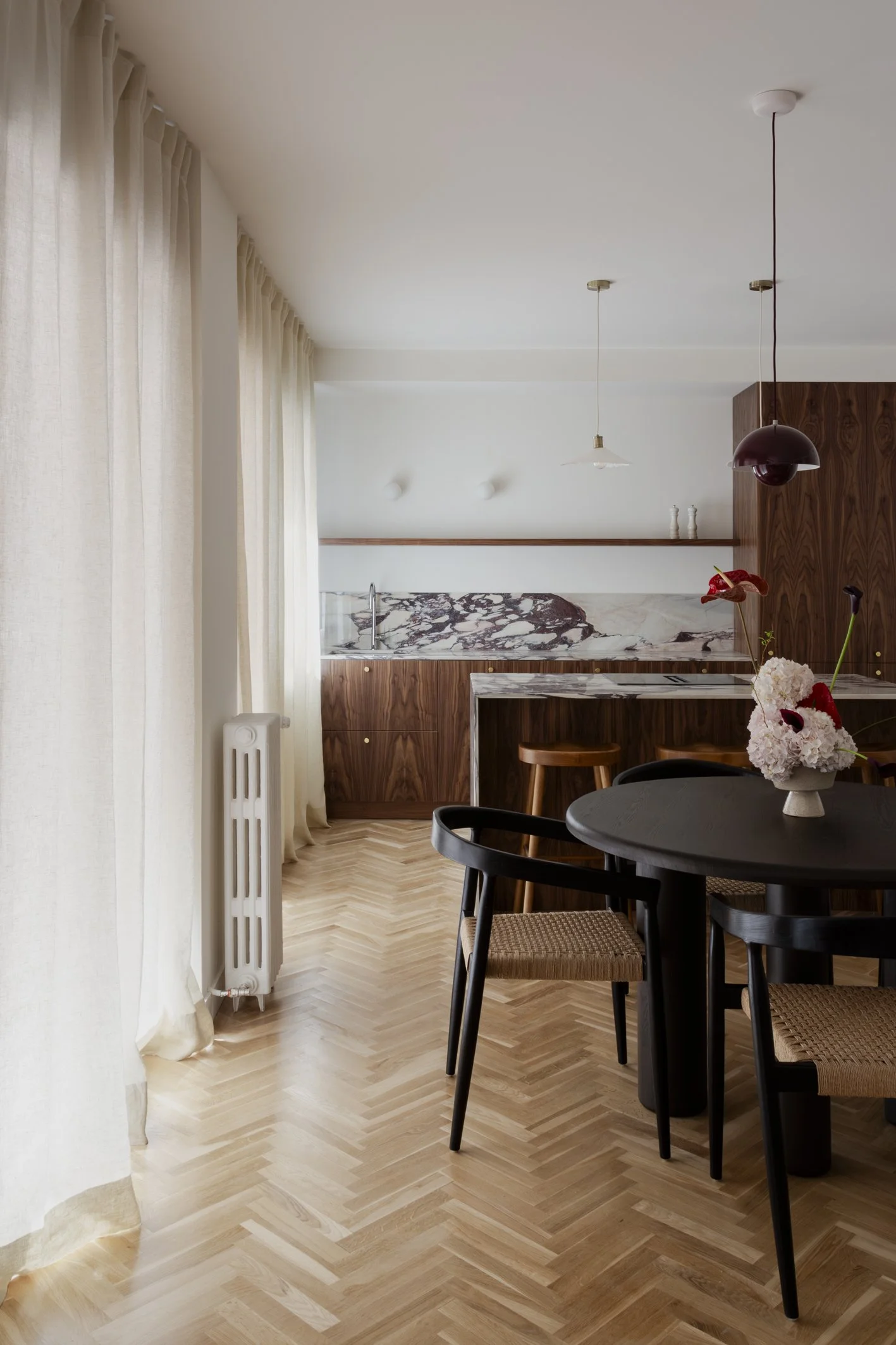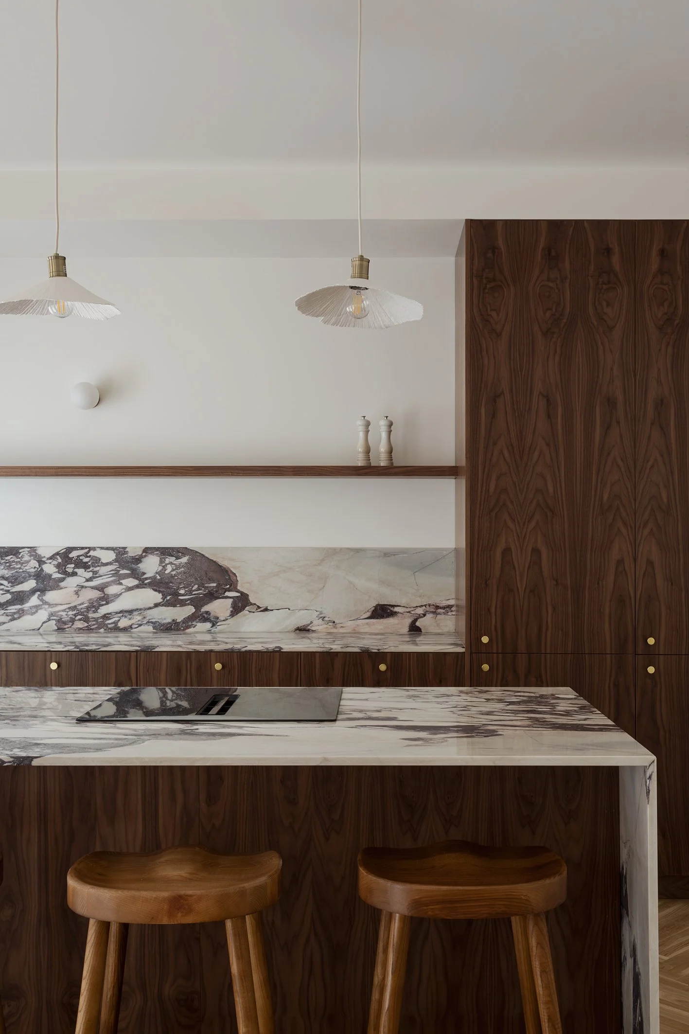 La cocina está formada por un frontal limpio con muebles bajos y una sutil balda volada, en paralelo una isla que da absoluto protagonismo a la piedra calacata viola y que mira al espacio del salón comedor. Una estancia abierta y llena de luz, que de nuevo, utiliza la carpintería a medida, para colonizar el espacio. En el lado, un mueble longitudinal de nogal señala la zona del salón y unas baldas completan la zona de lectura.