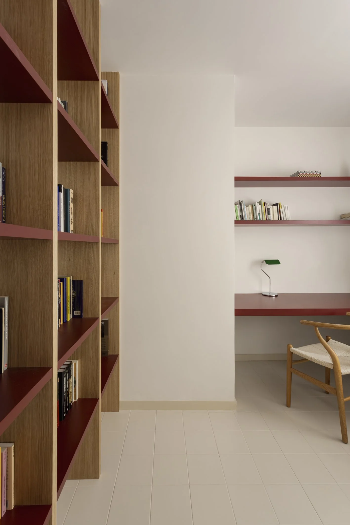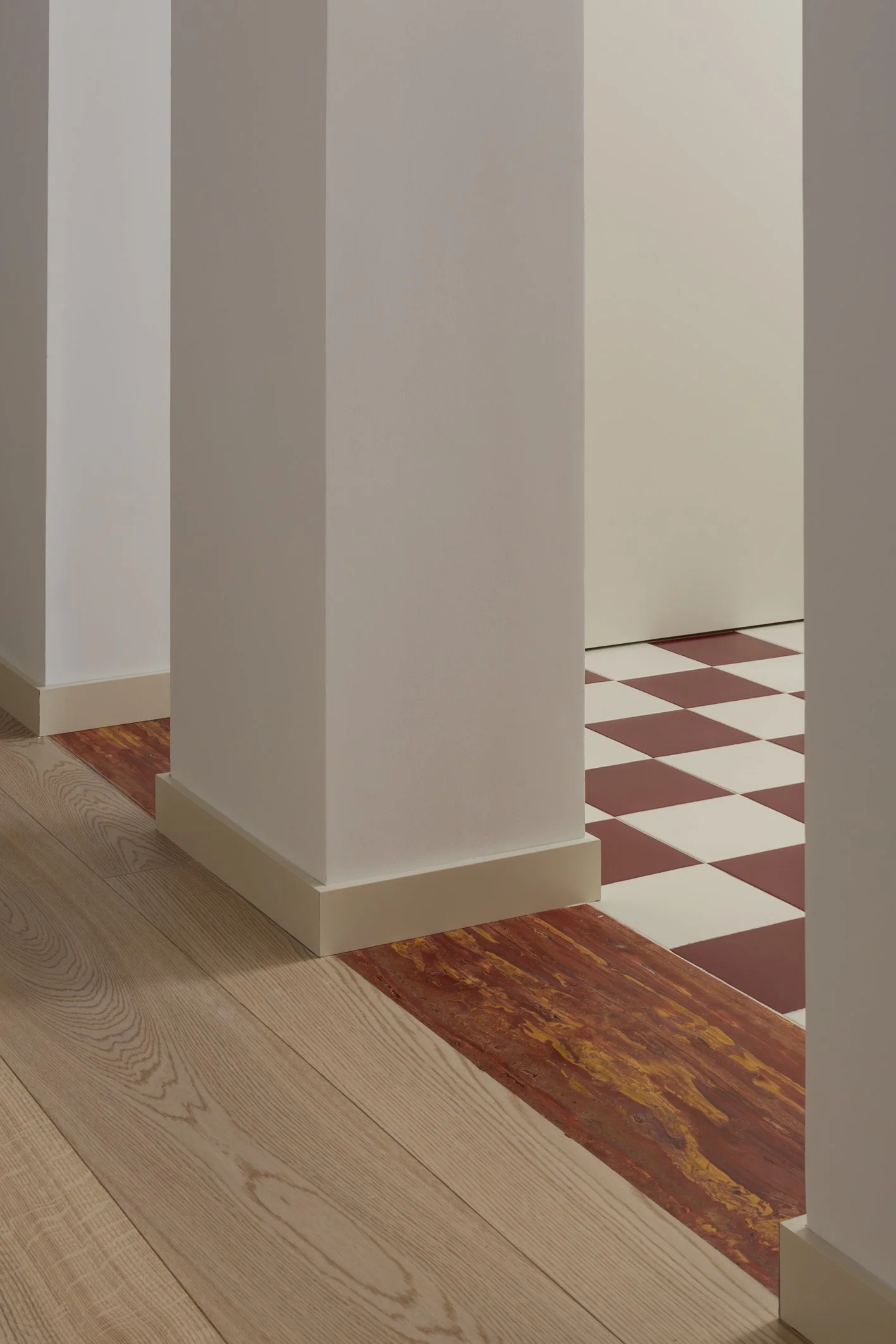 Atravesando la puerta, el damero desaparece, y el burdeos se traslada a los elementos horizontales de la carpintería, que contrastan con los verticales de roble.