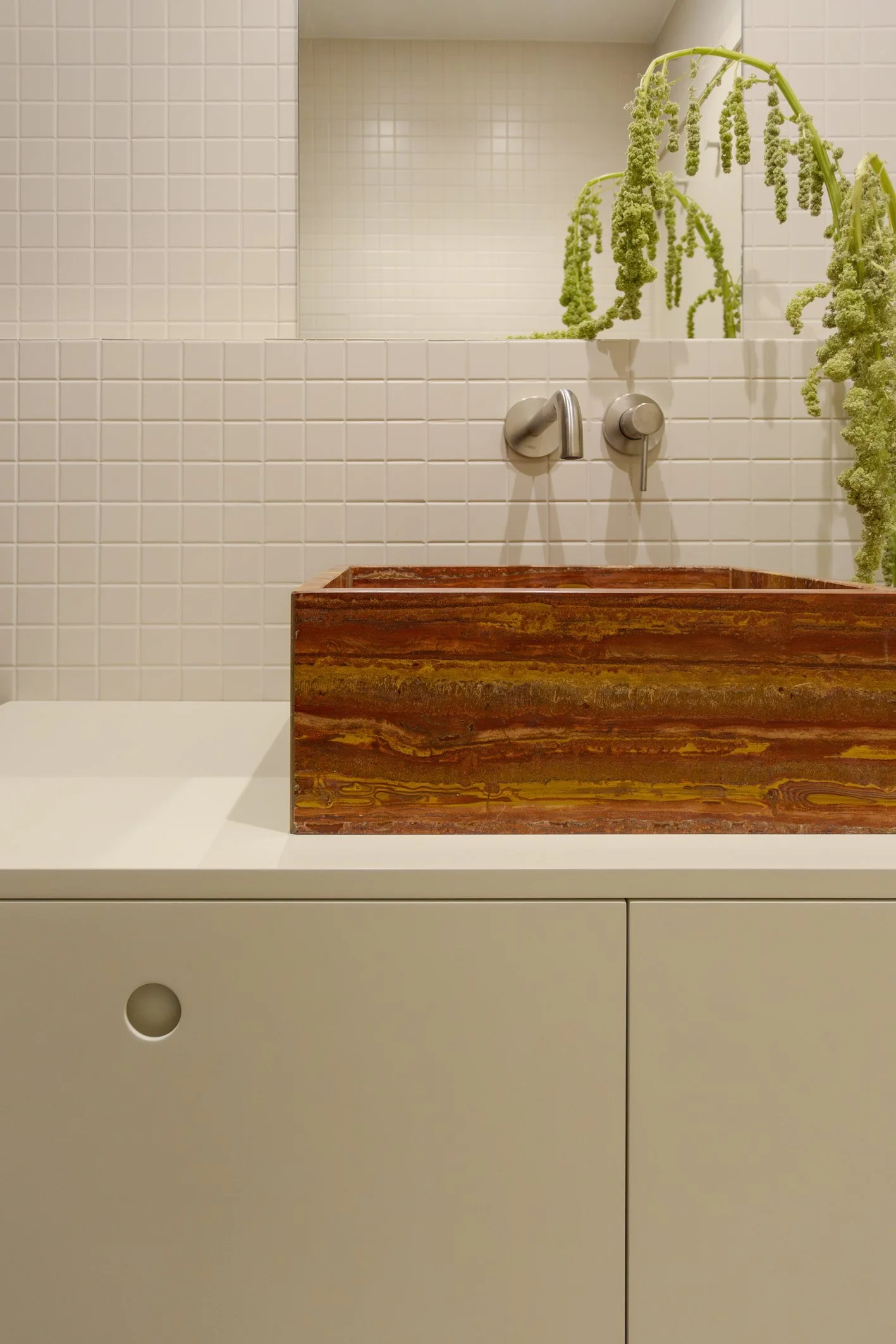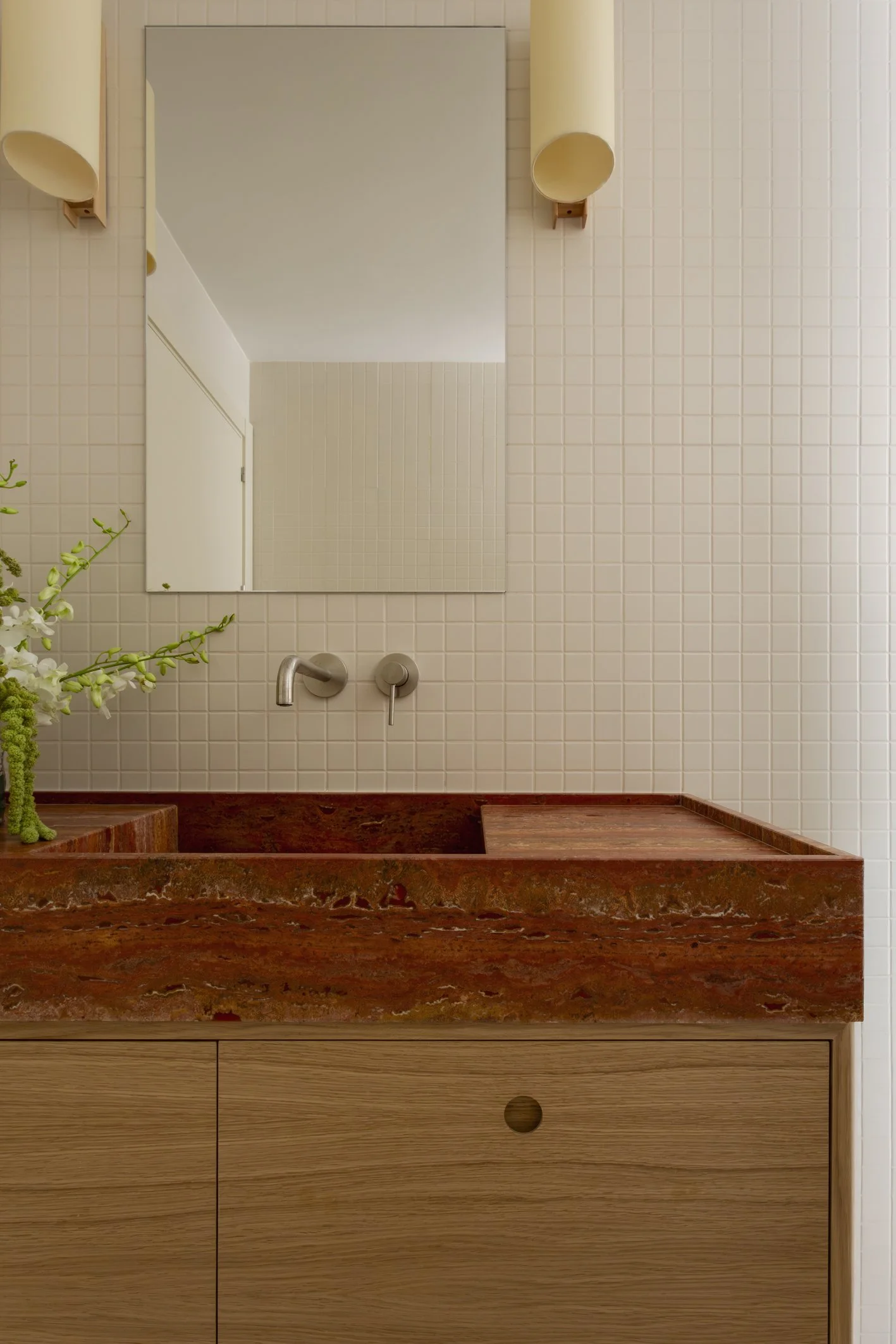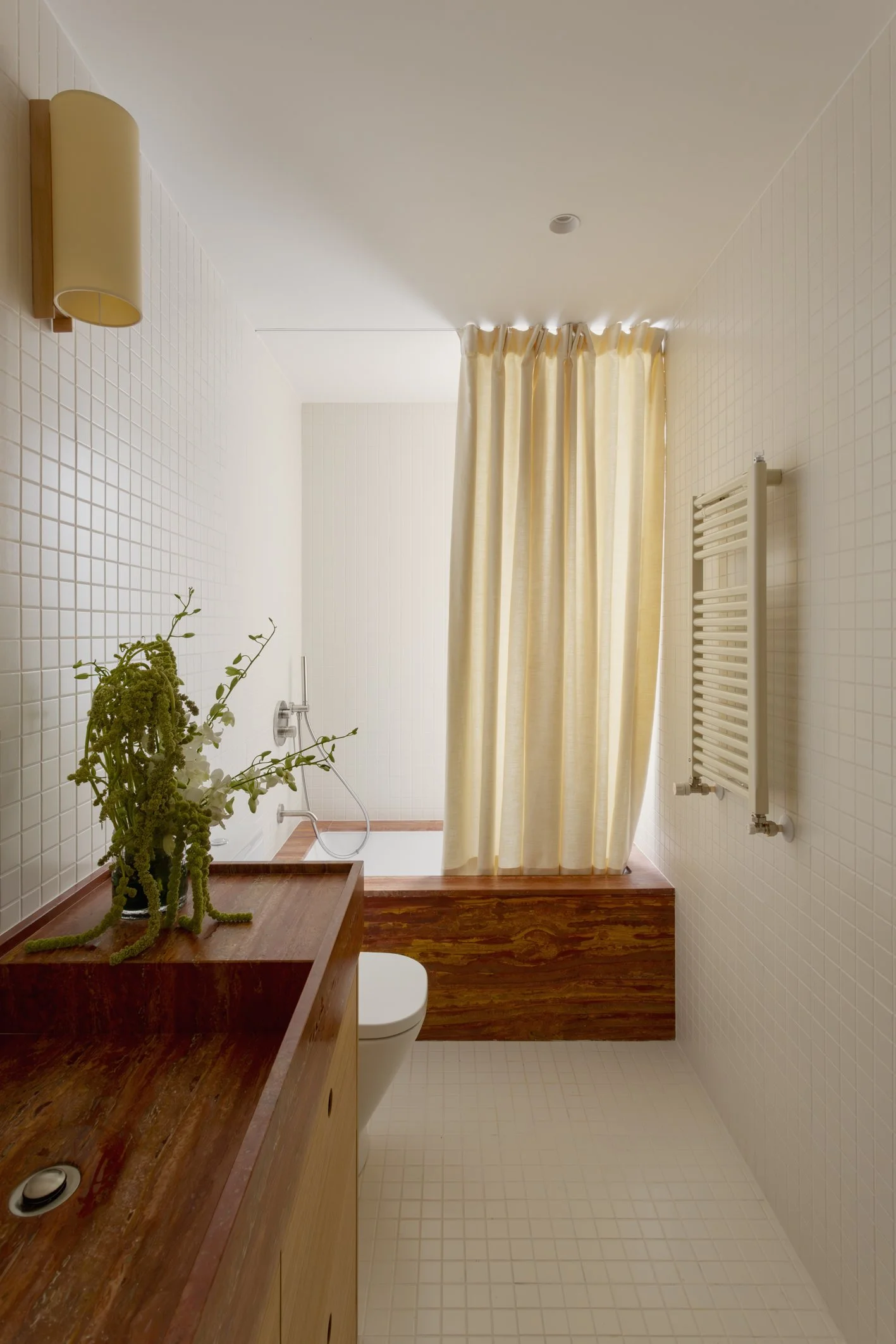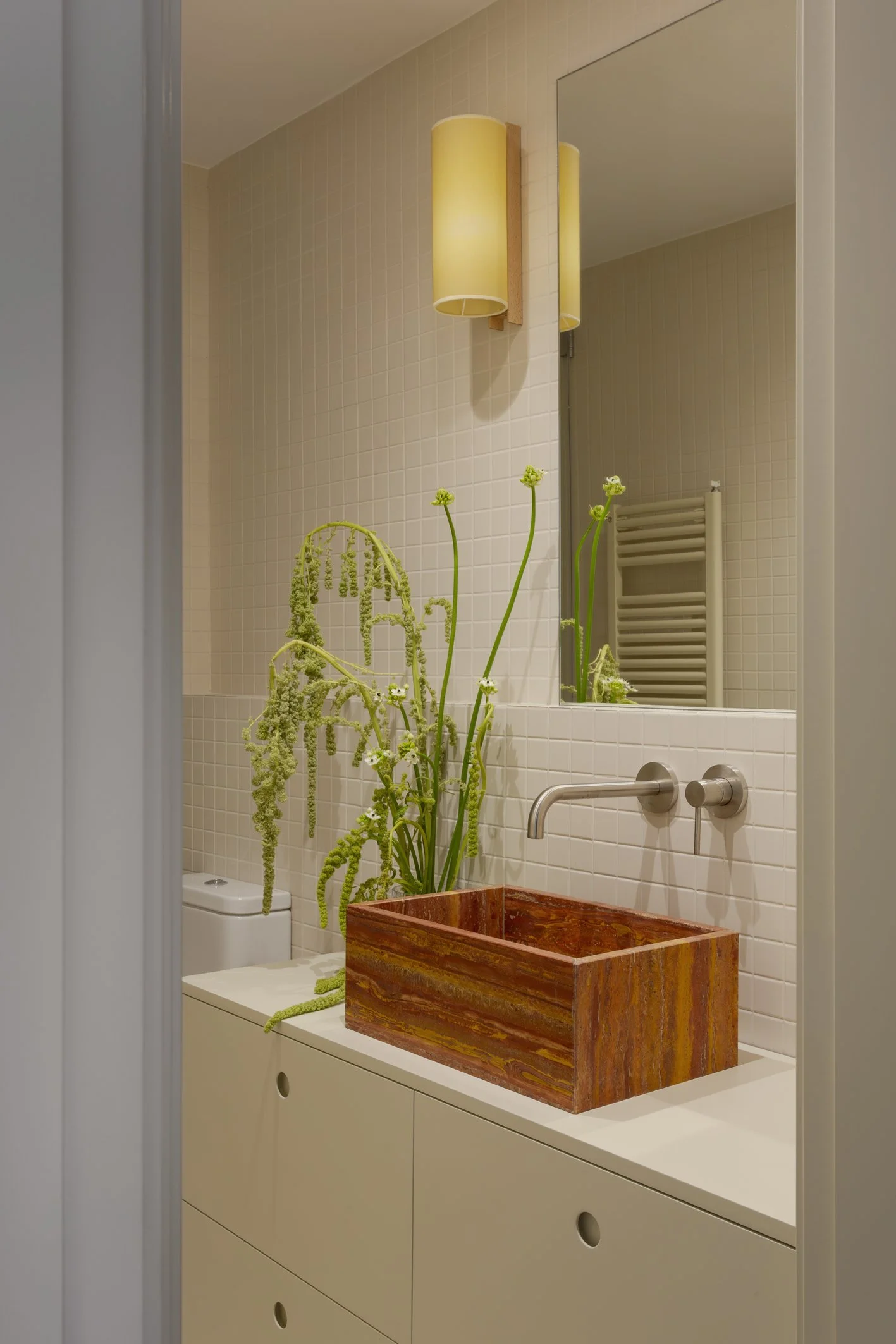 Los baños los revestimos con alicatados que aportan una textura uniforme a todo el espacio. El principal, que no posee luz natural tenía que ser en tonos muy suaves, por lo que sobre el mueble, del mismo color del alicatado destaca el lavabo en travertino rojo persa, ganando todo el protagonismo en este espacio. Mientras, en el baño secundario, que dispone de ventana, aprovechamos para incluir la piedra en el revestimiento de la bañera y en la encimera de lavabo que apoya sobre un mueble en roble natural, que junto a la cortina aportan el toque cálido al espacio.