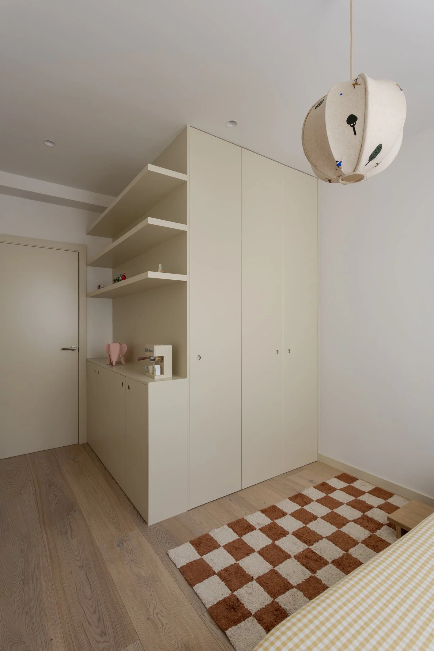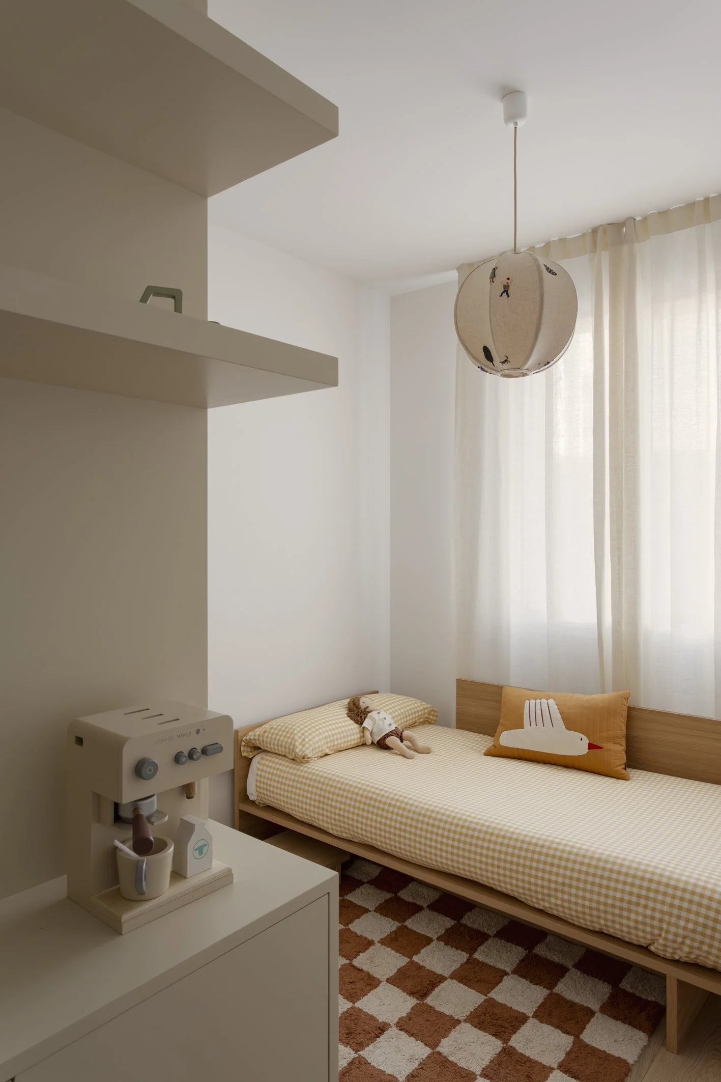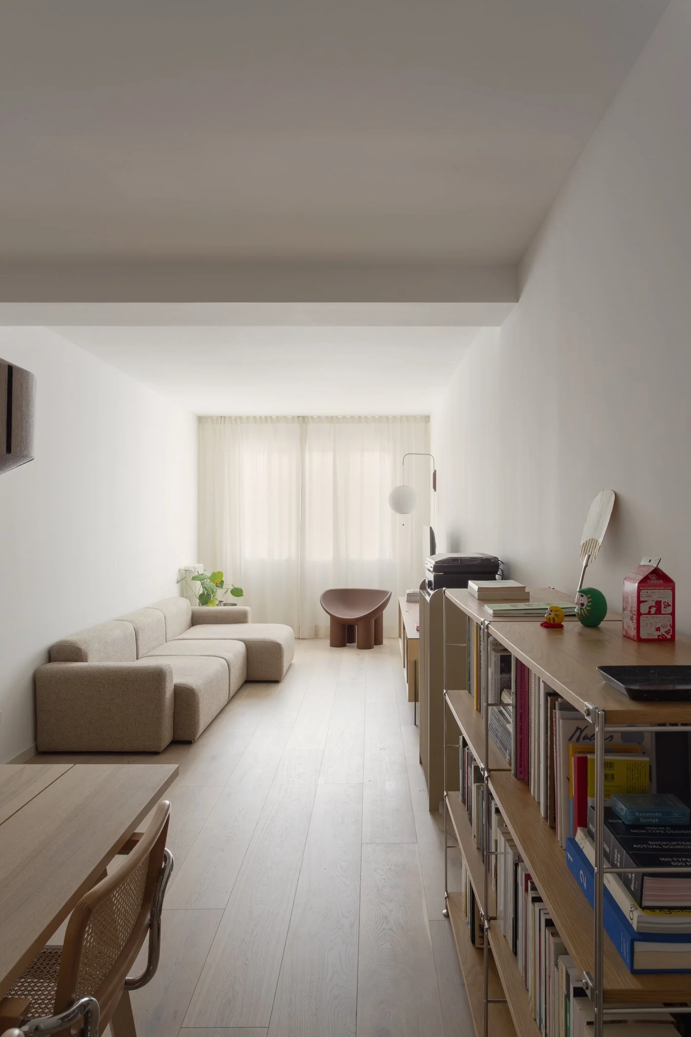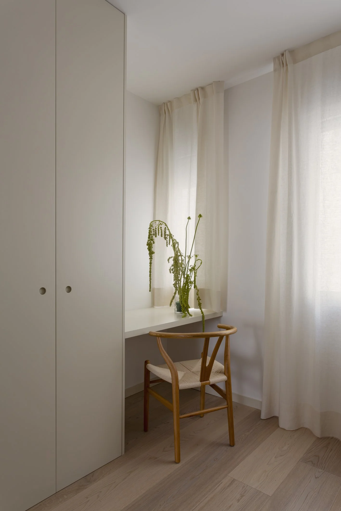 La tarima de roble natural se dispone desde la entrada hacia el salón, llegando a todos los dormitorios, combinando con la carpintería en tonos beige y los textiles en lino natural, que aportan ese punto de calidez a los espacios