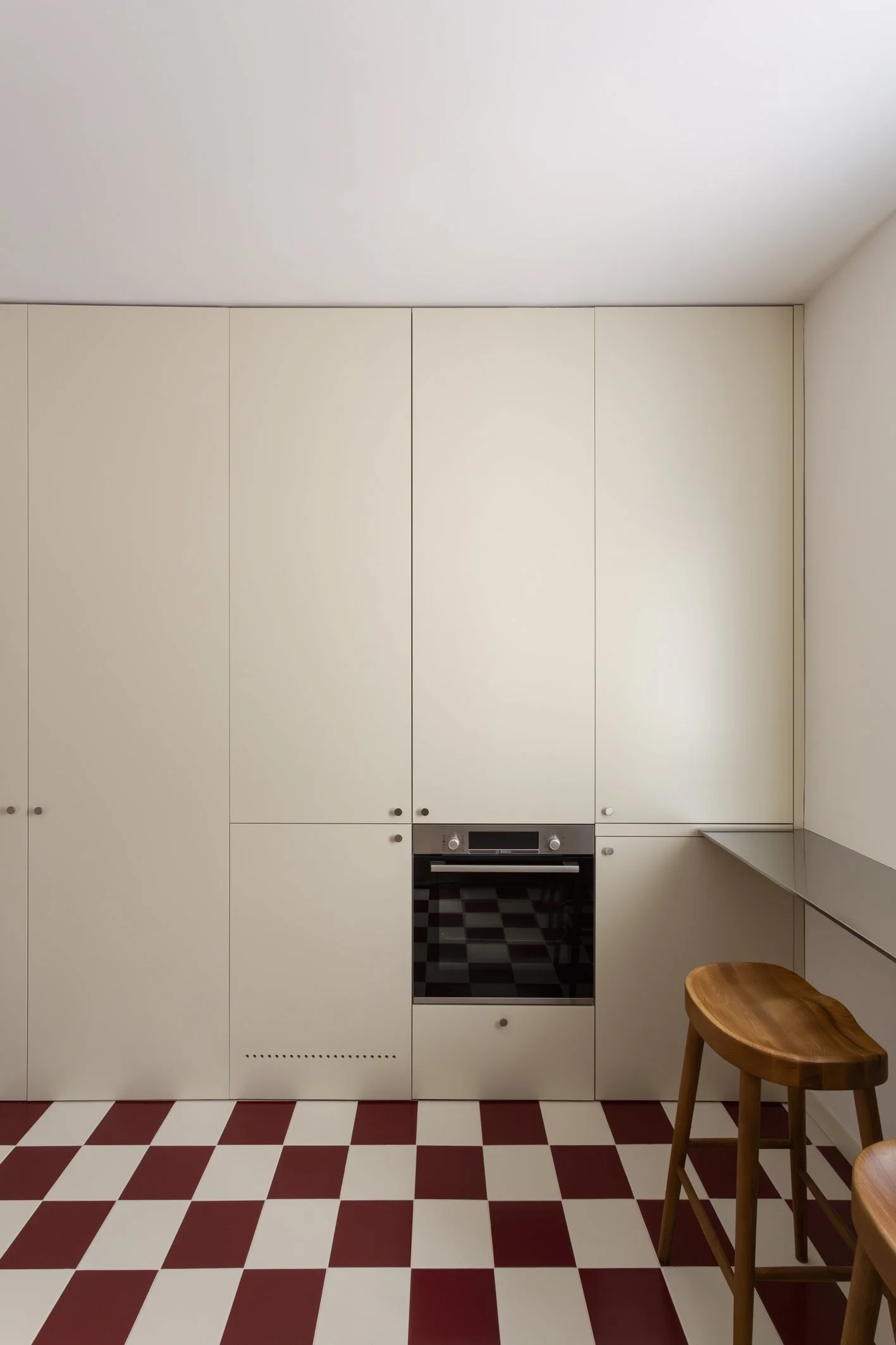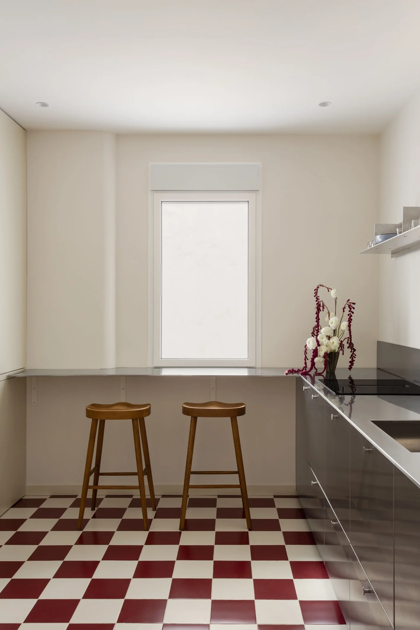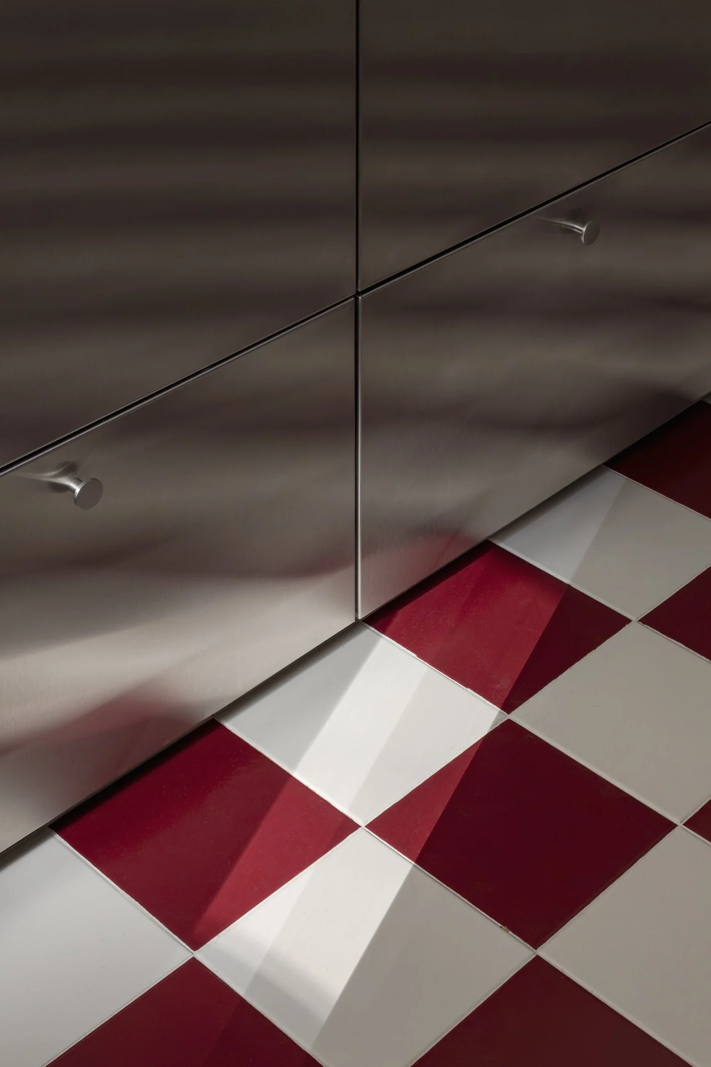 La piedra vuelve a estar presente en la cocina, creando una transición desde el pavimento de madera del pasillo hasta el maravilloso damero en tonos beige y burdeos. Que se reflejan en el metal de los muebles bajos de cocina, generando un juego de luces y colores. Ganando la atención frente a la pared de módulos de cocina que ocultan el acceso al estudio.