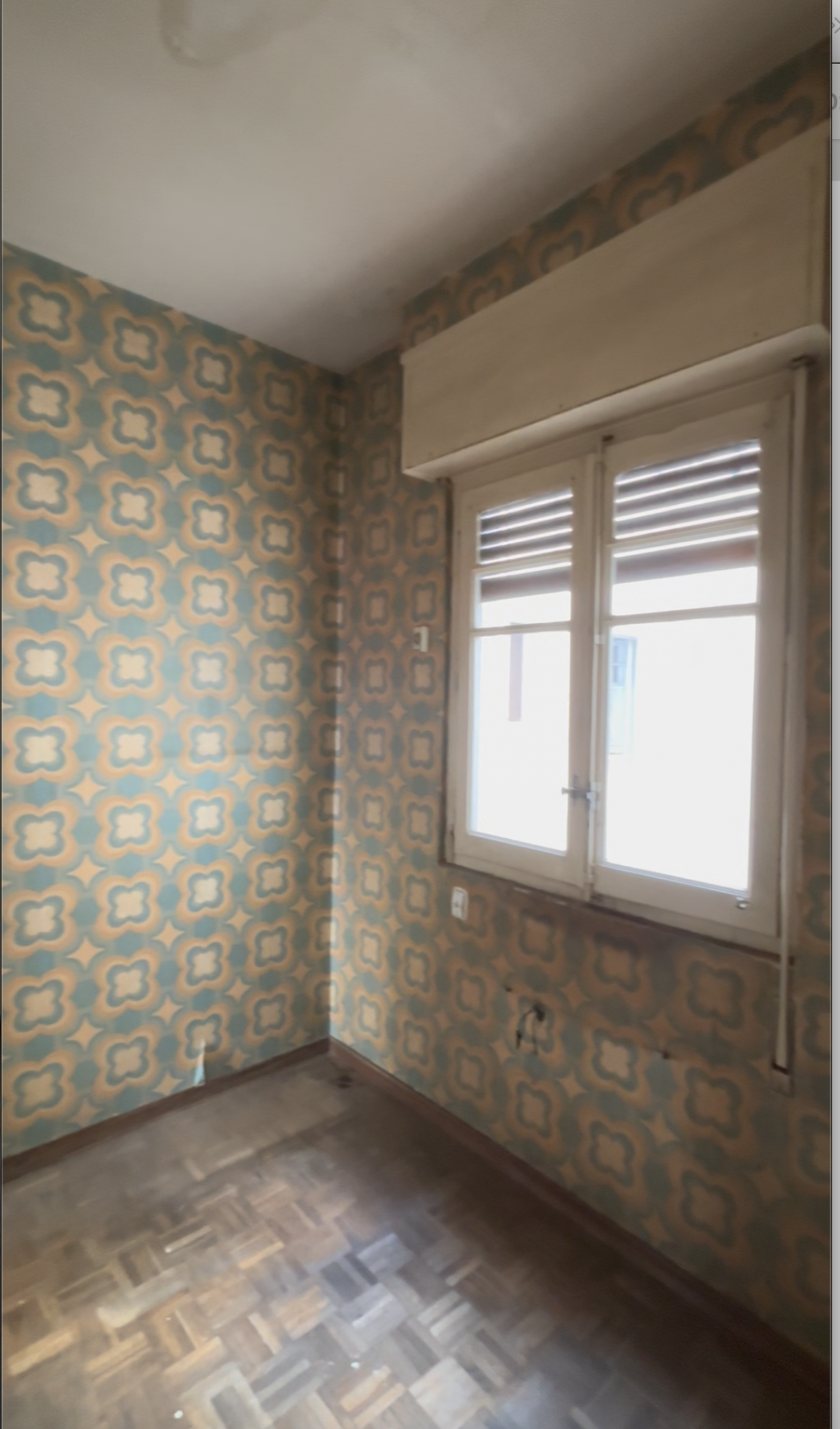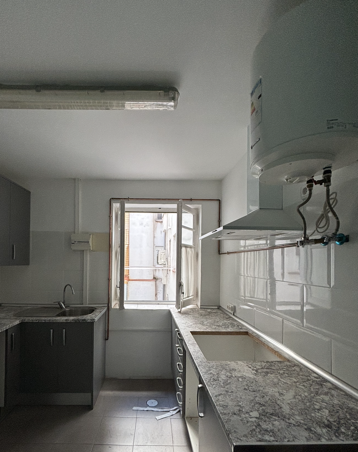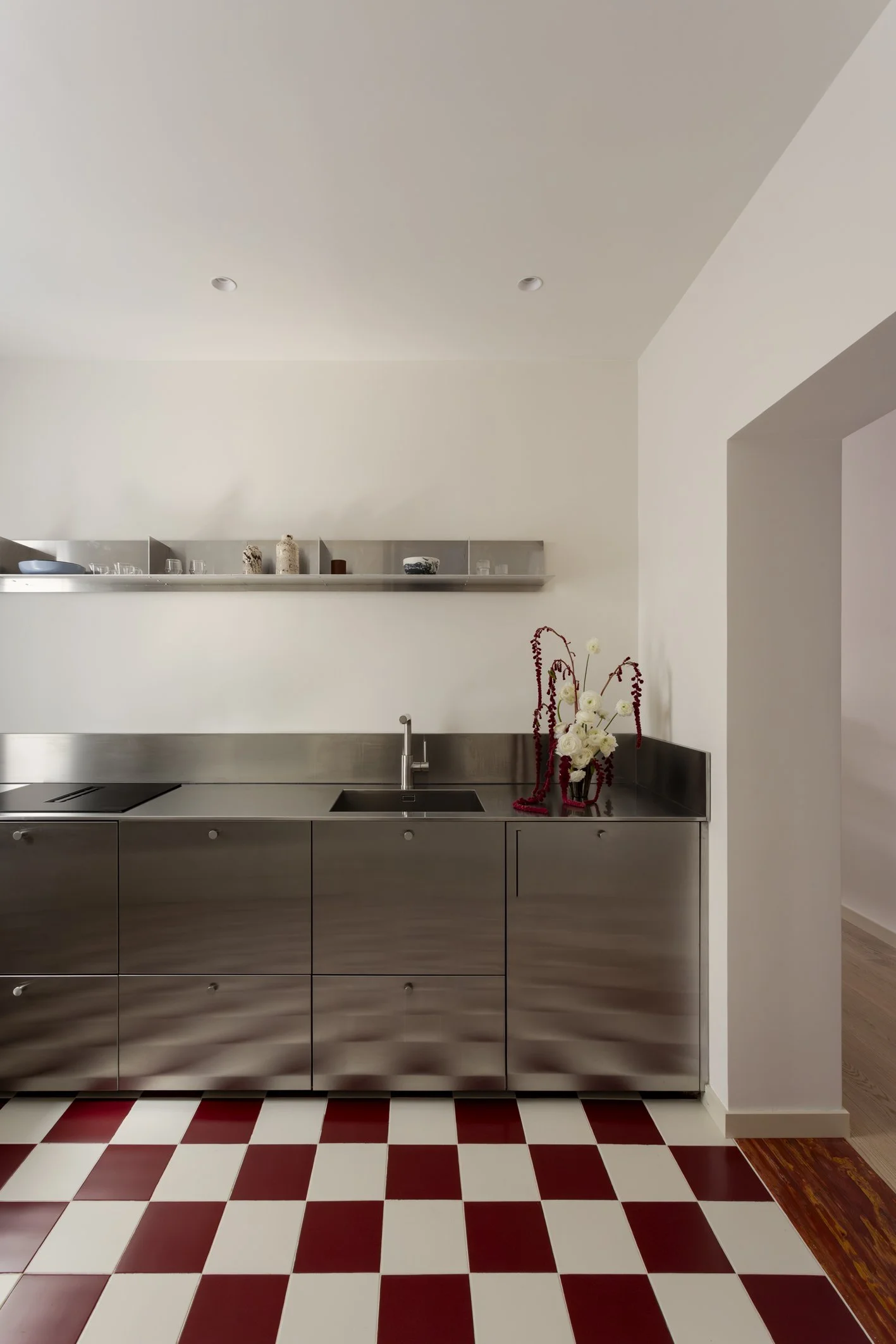 La piedra vuelve a estar presente en la cocina, creando una transición desde el pavimento de madera del pasillo hasta el maravilloso damero en tonos beige y burdeos. Que se reflejan en el metal de los muebles bajos de cocina, generando un juego de luces y colores. Ganando la atención frente a la pared de módulos de cocina que ocultan el acceso al estudio.