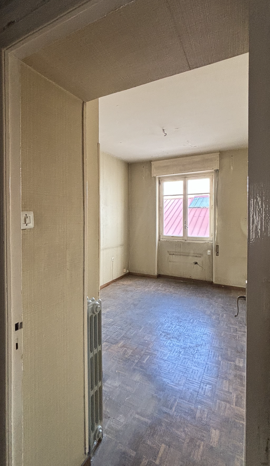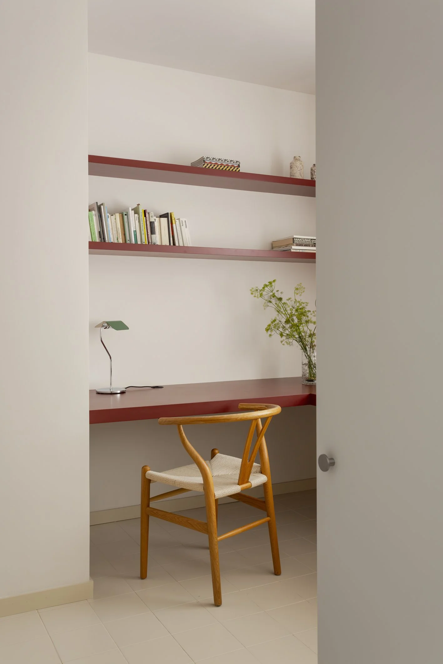 “Rojo, blanco y madera para un antiguo piso de los 50 reconvertido en casa moderna”
