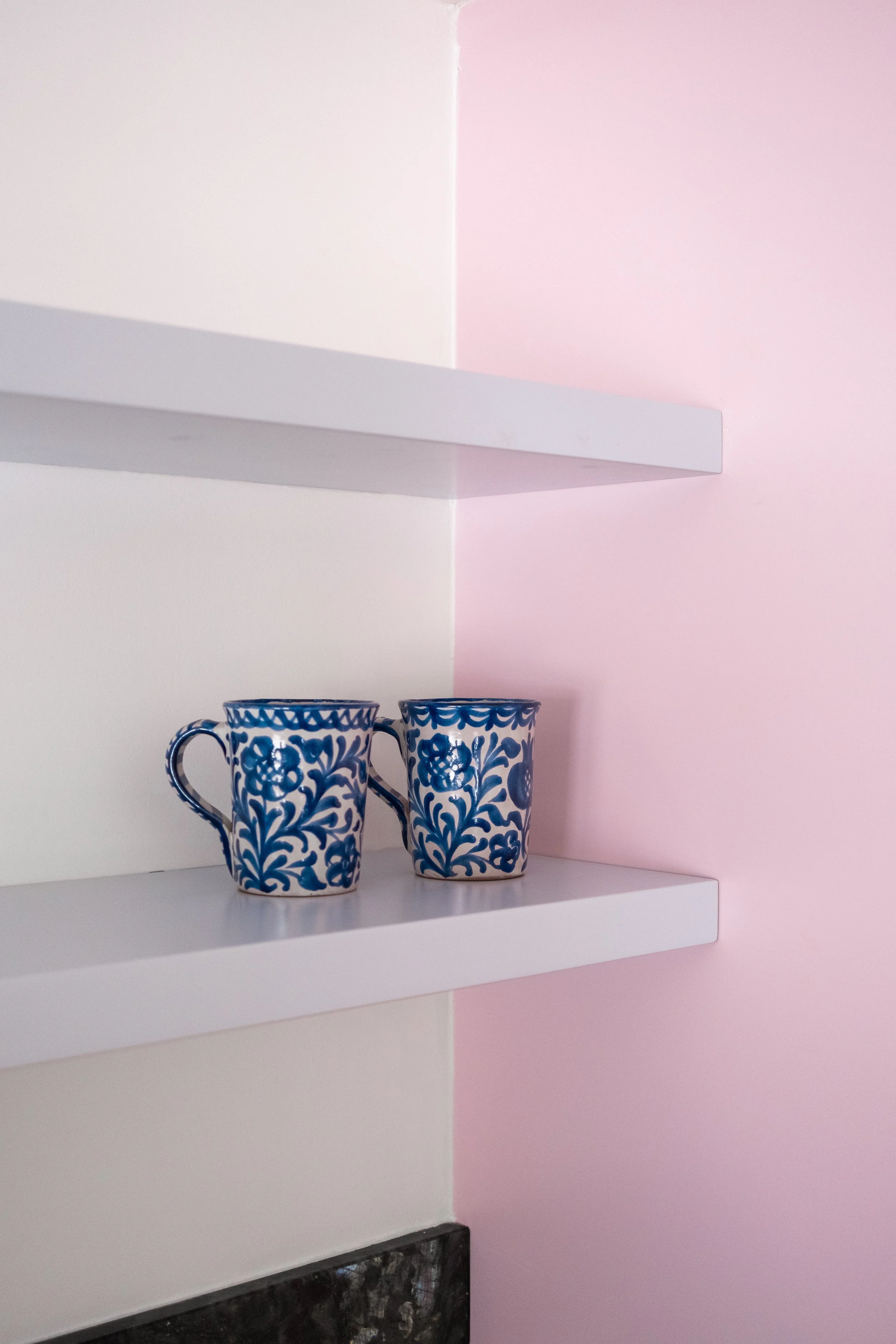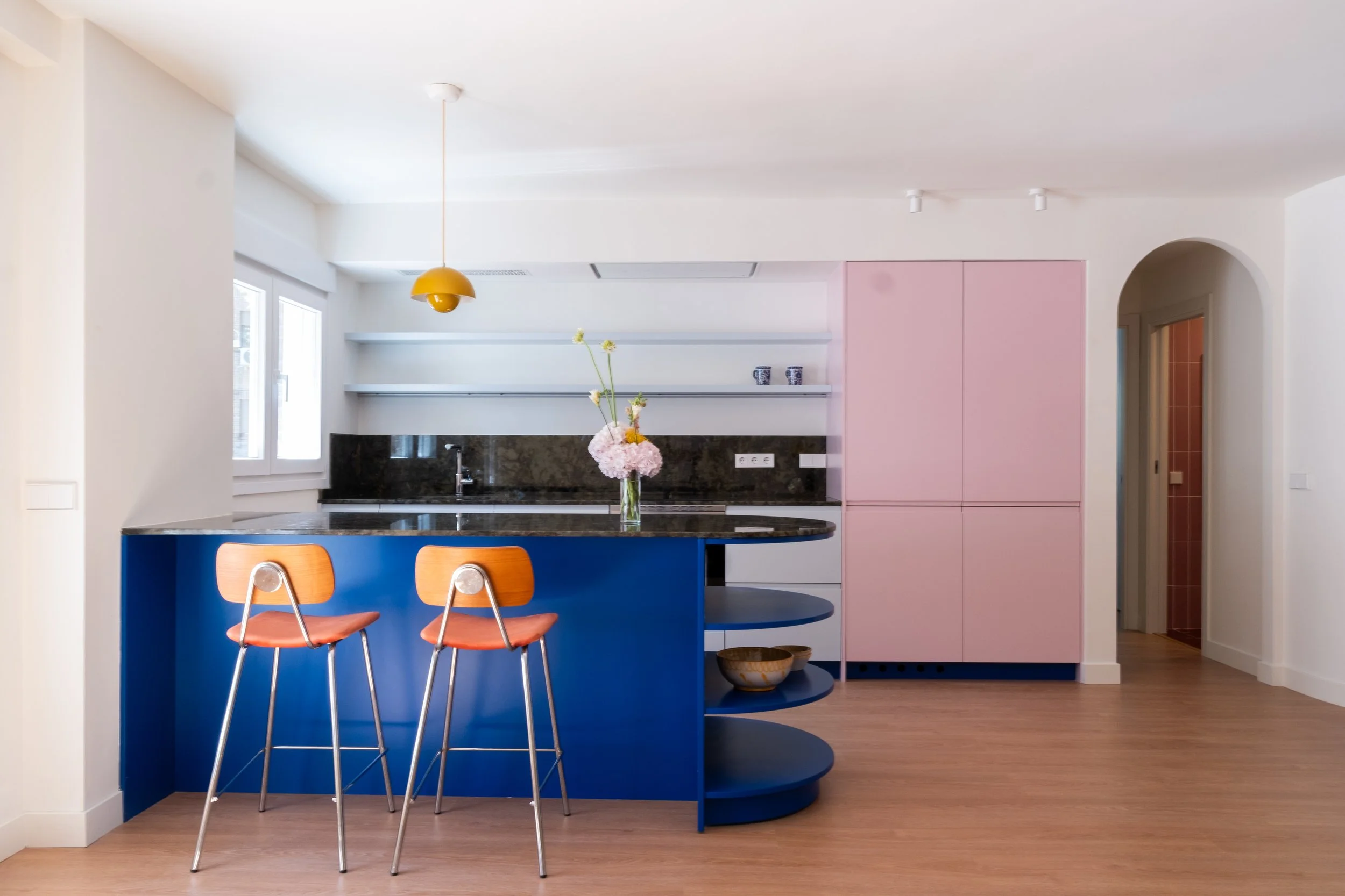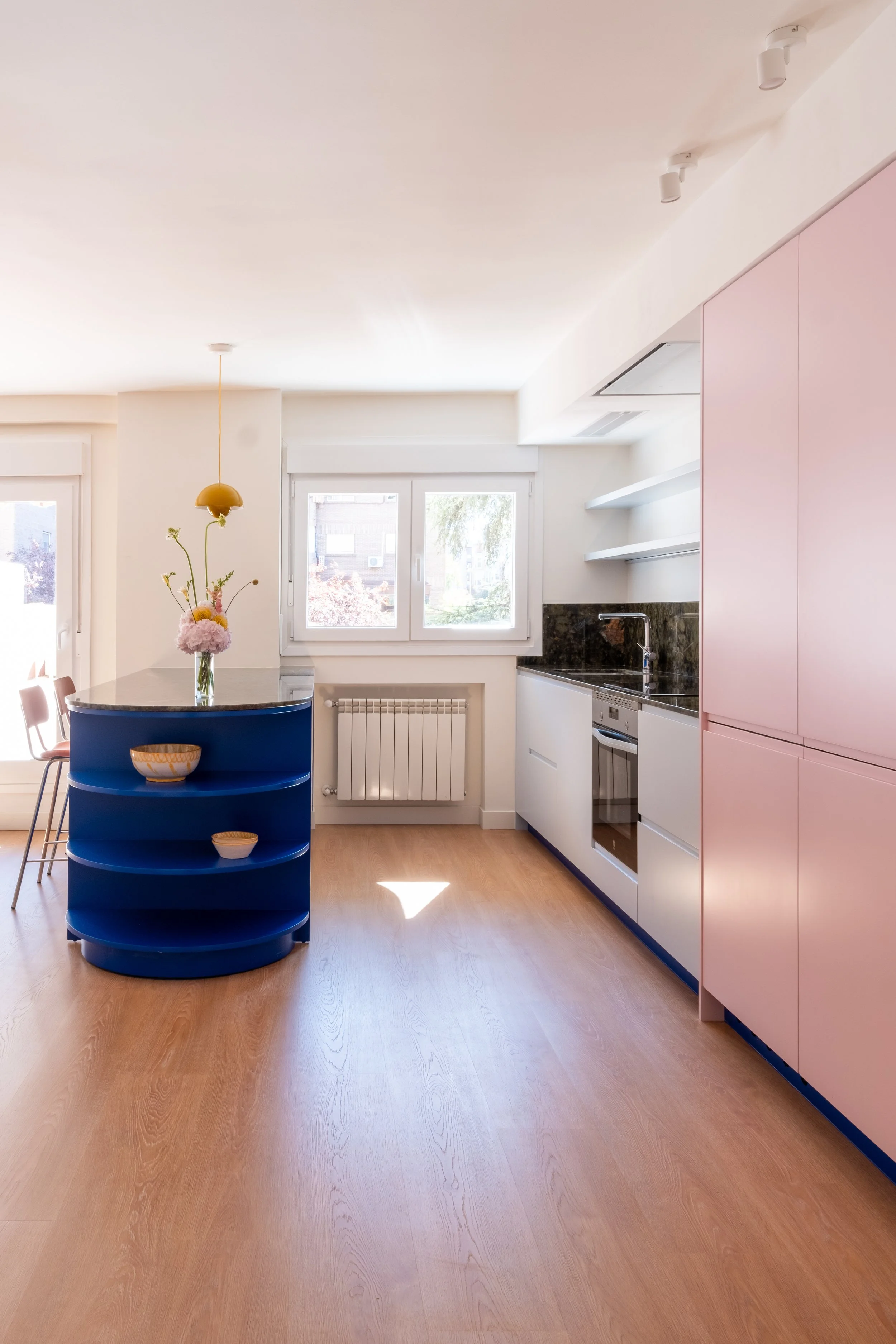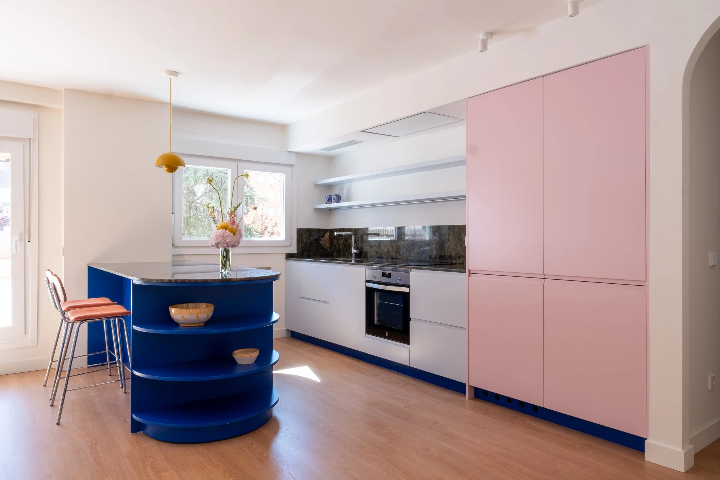 El azul cobalto protagoniza la cocina, combinado con azul cielo, rosa pastel y la preciosa encimera verde.