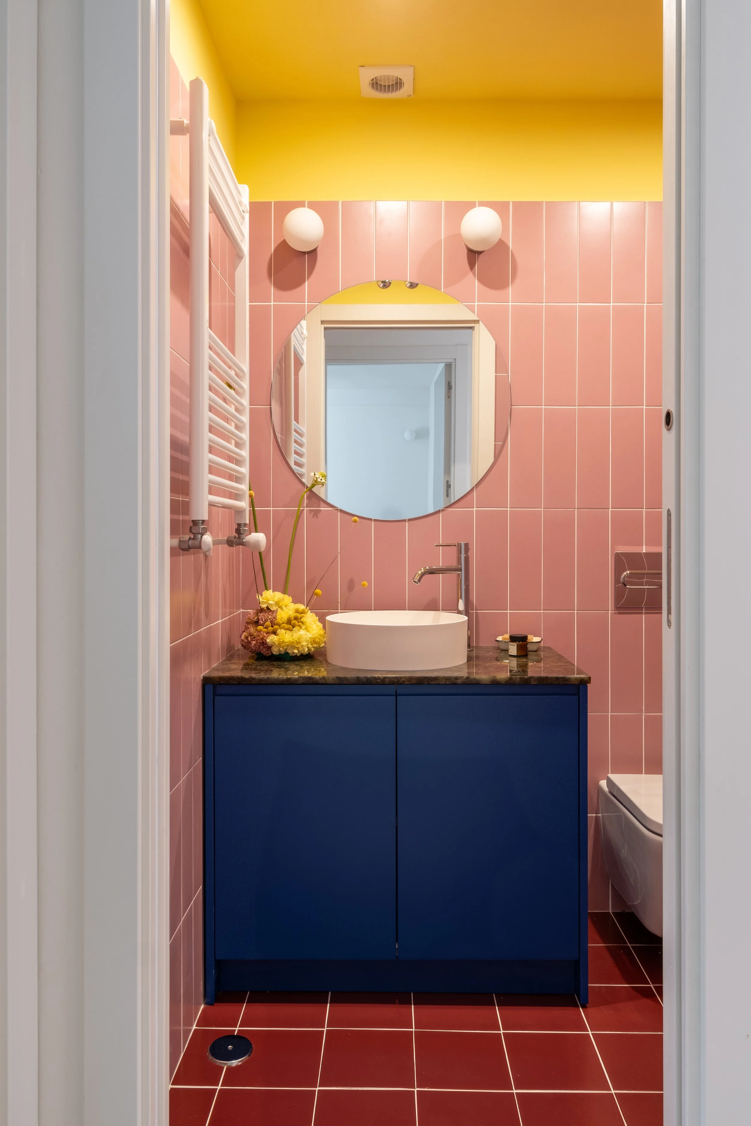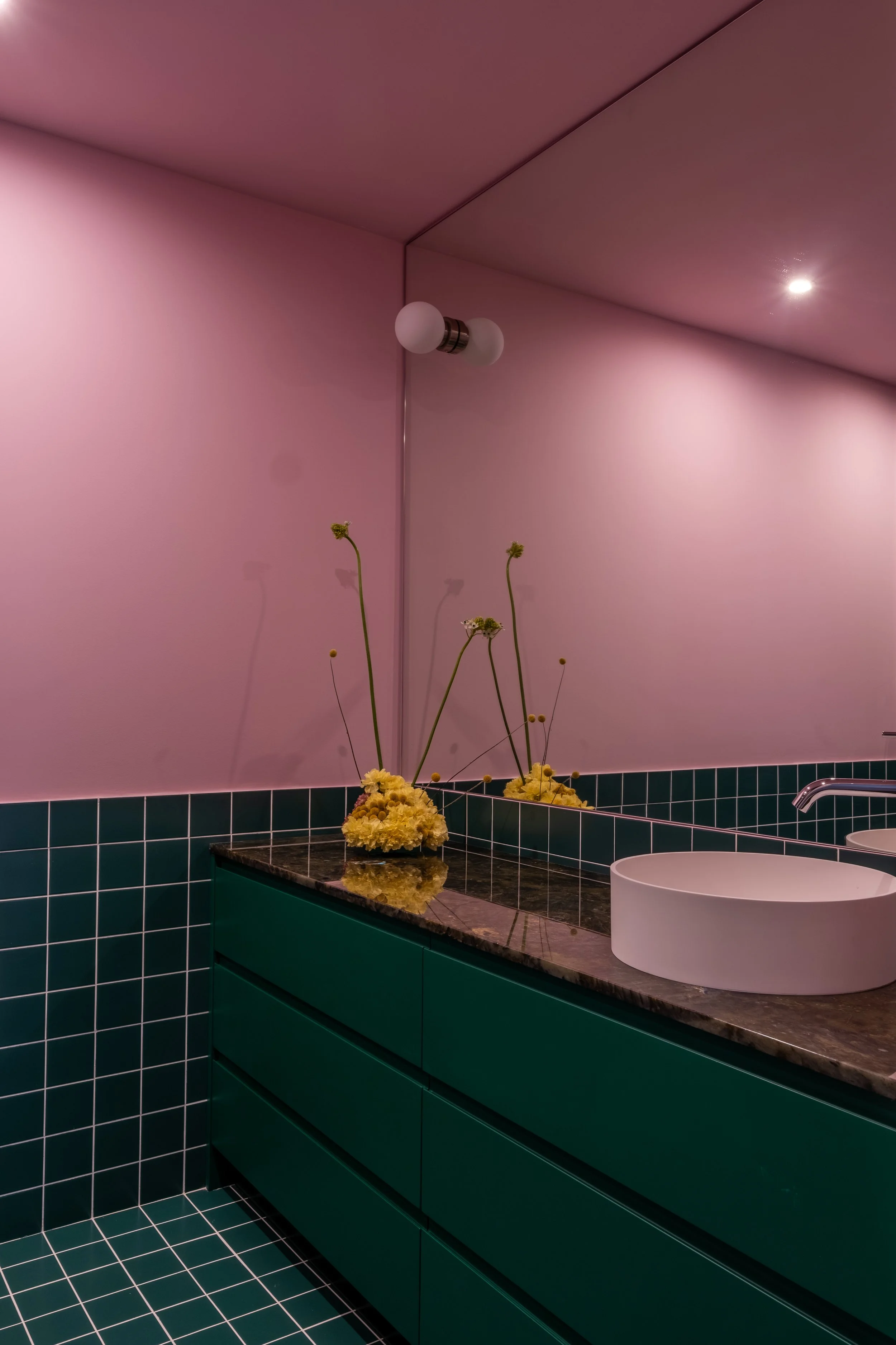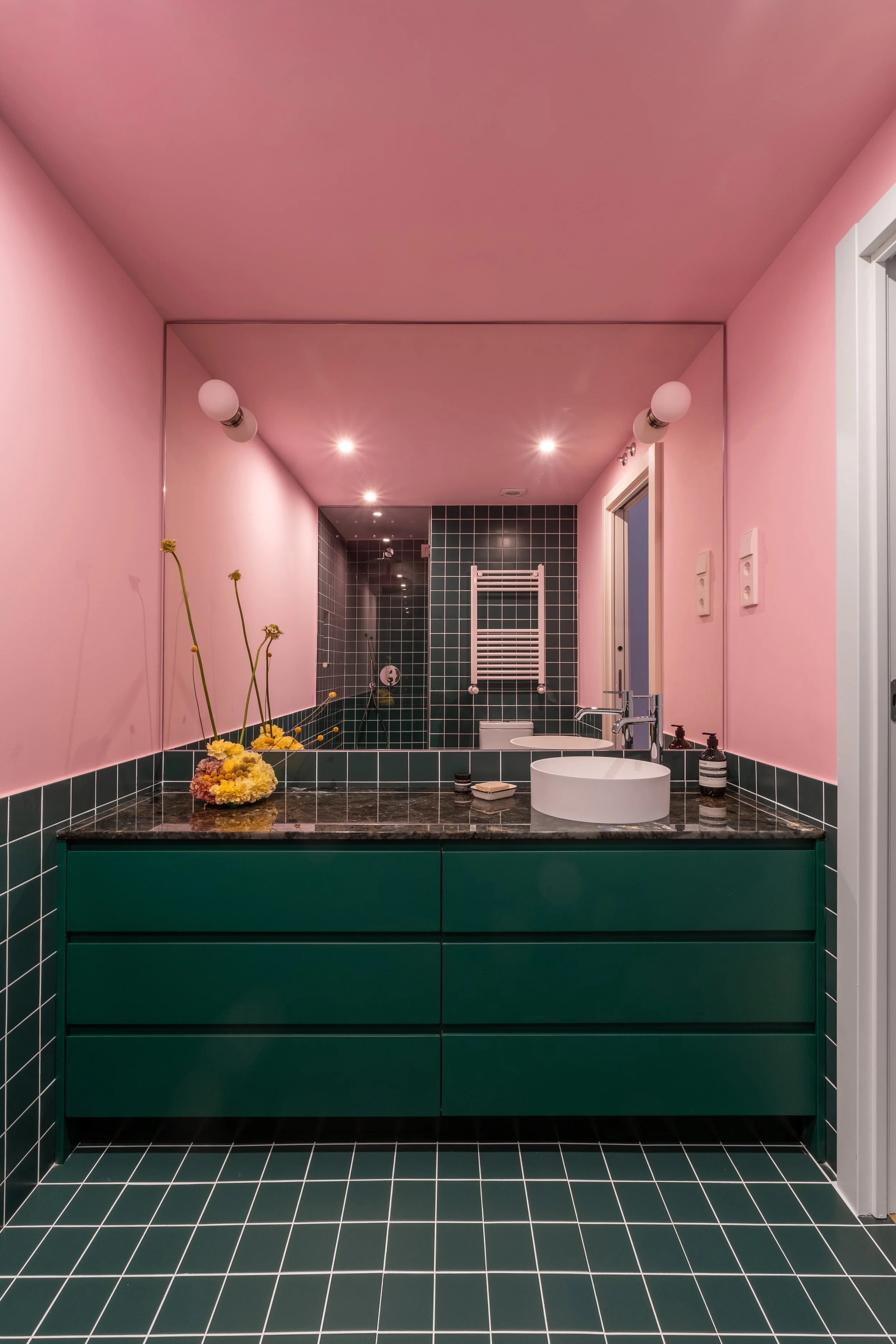 La combinación de colores es el eje principal del diseño, jugando con el alicatado, la pintura y una potente piedra verde, para crear atmósferas vibrantes y llenas de personalidad.