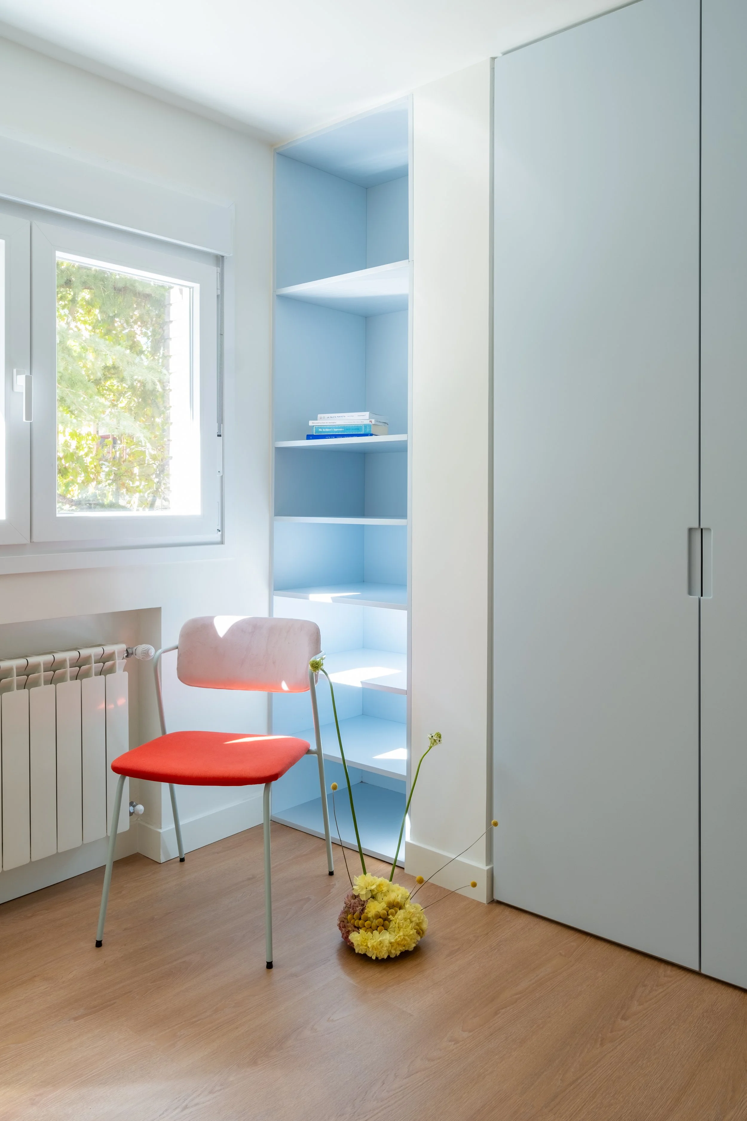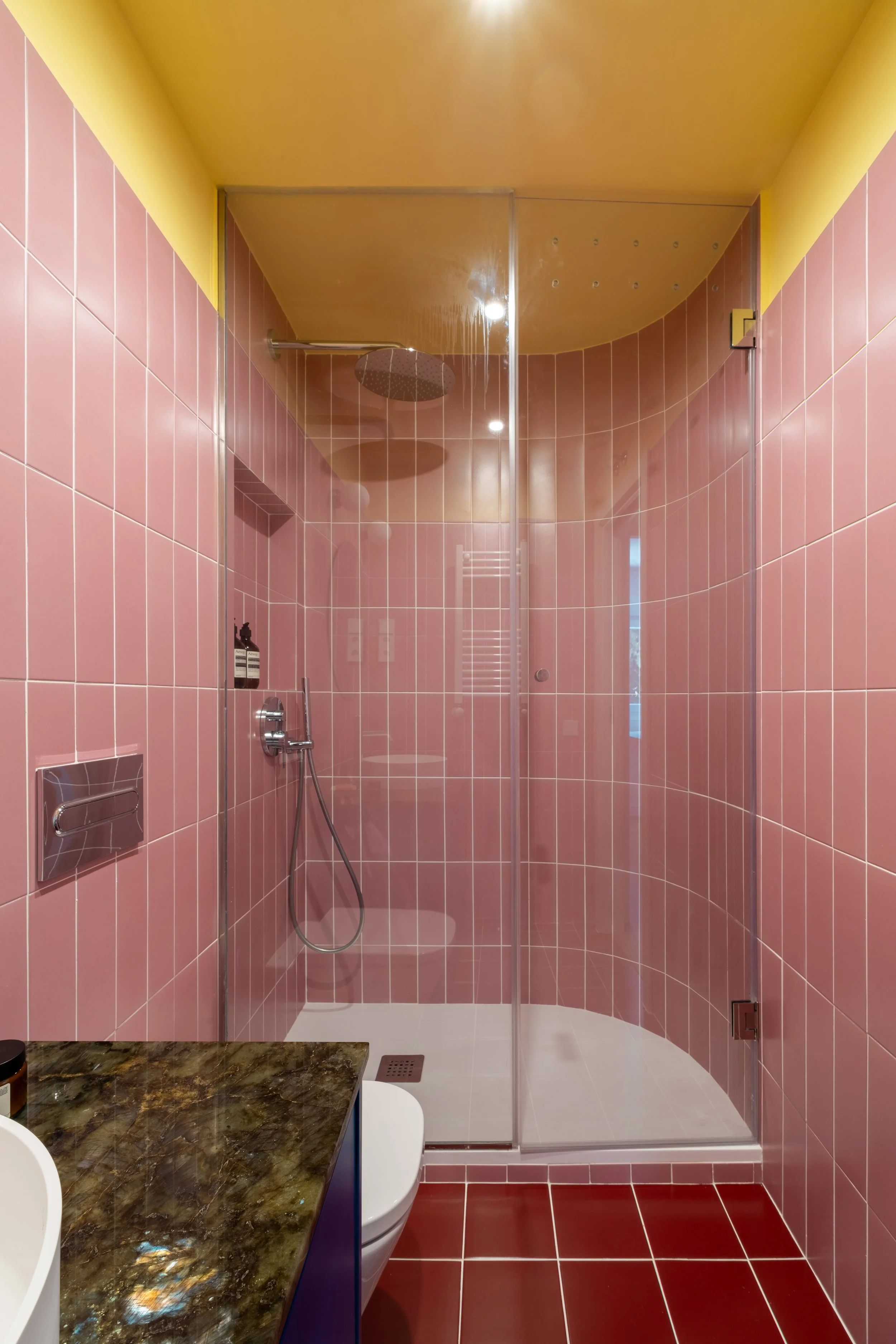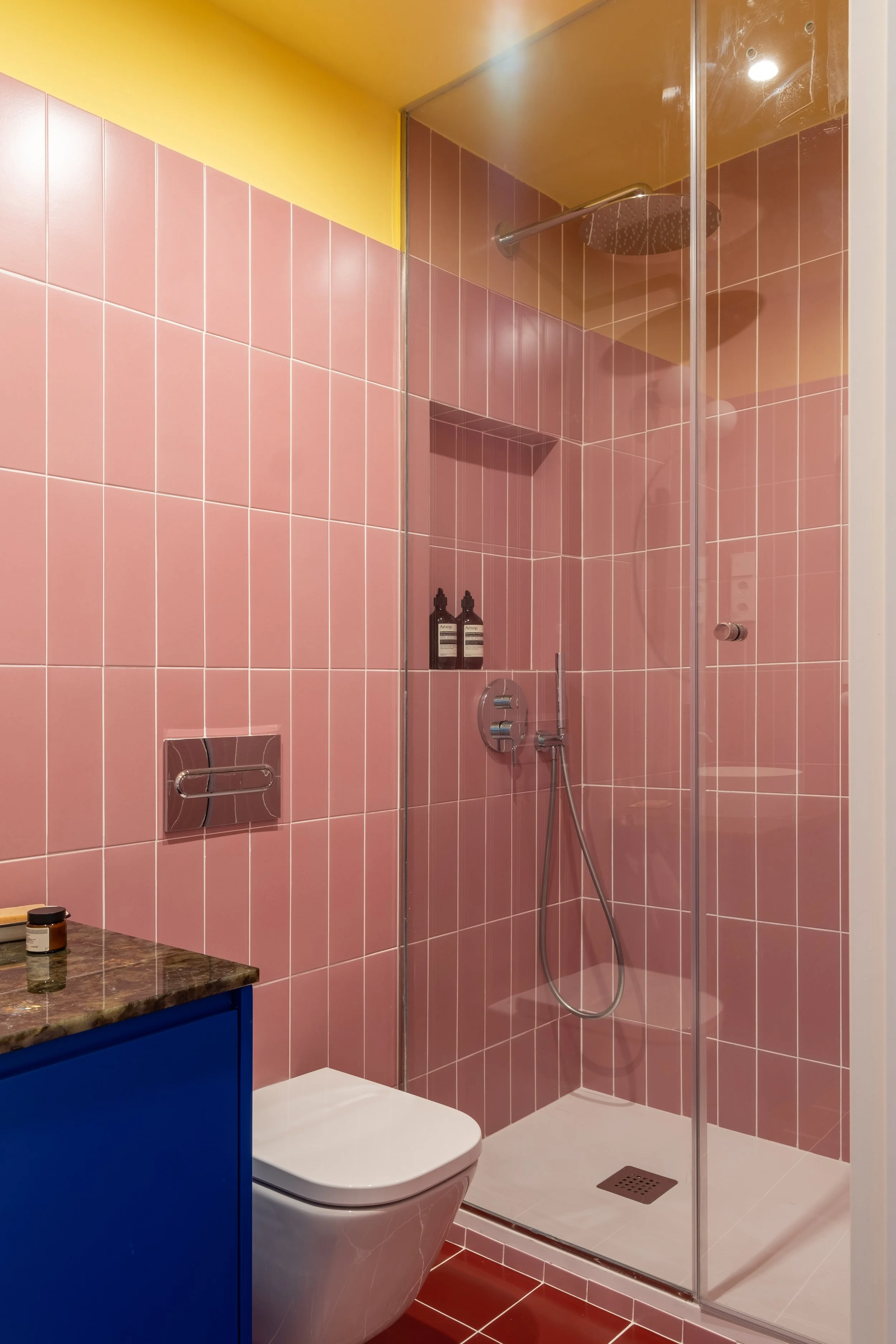 La combinación de colores es el eje principal del diseño, jugando con el alicatado, la pintura y una potente piedra verde, para crear atmósferas vibrantes y llenas de personalidad.