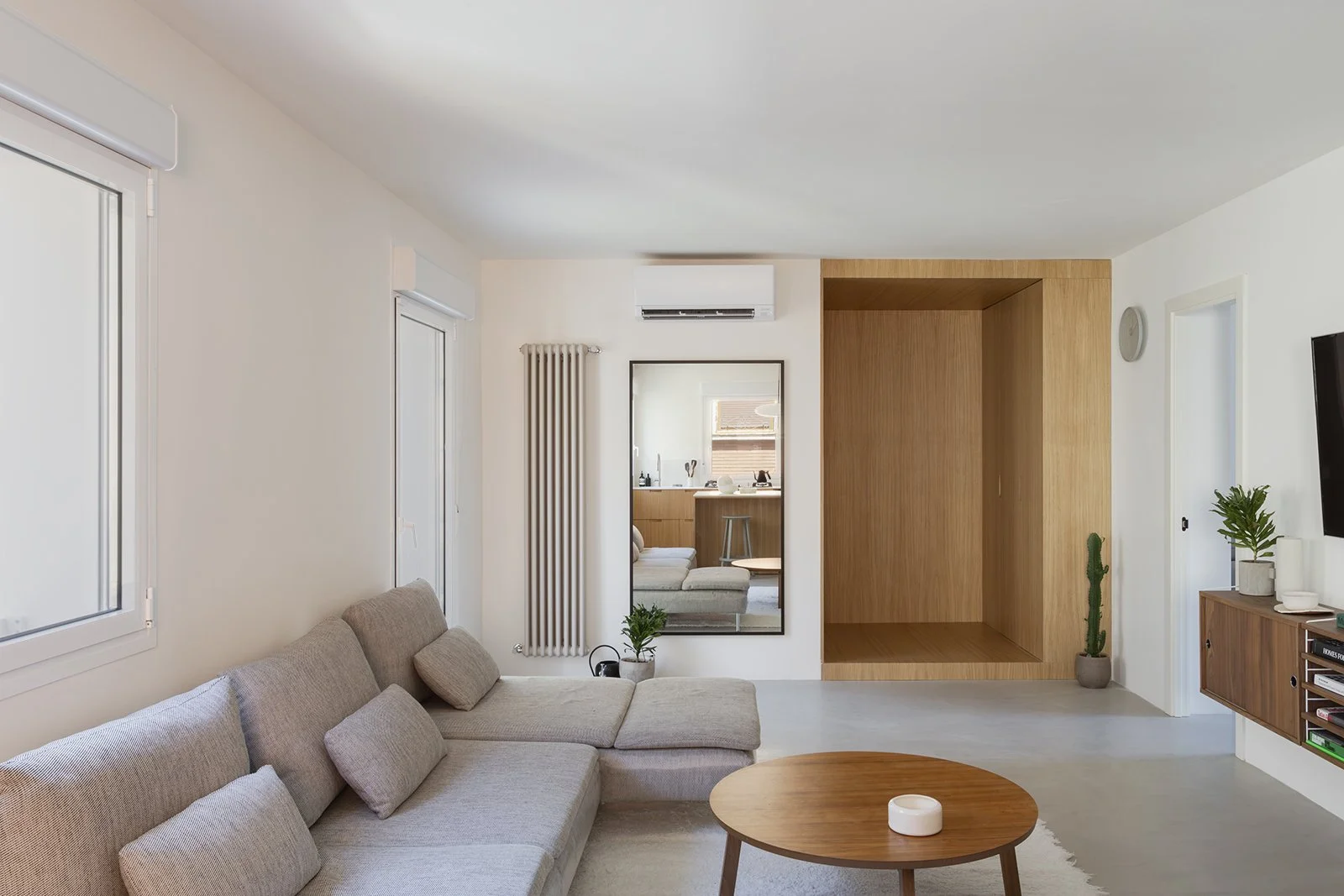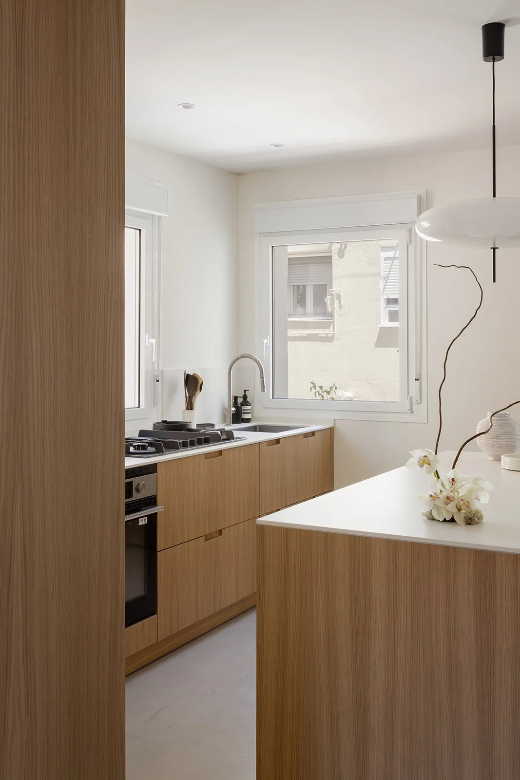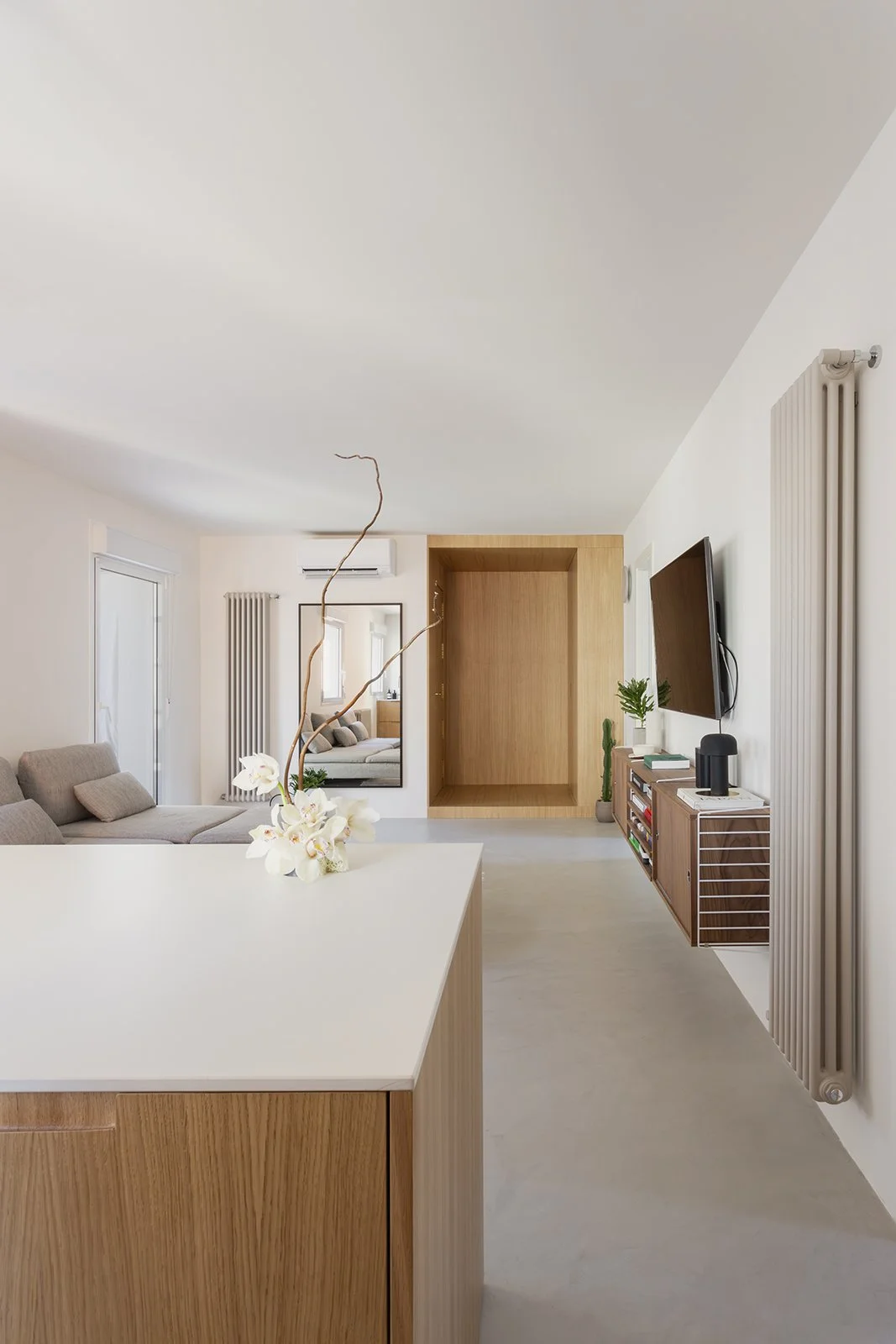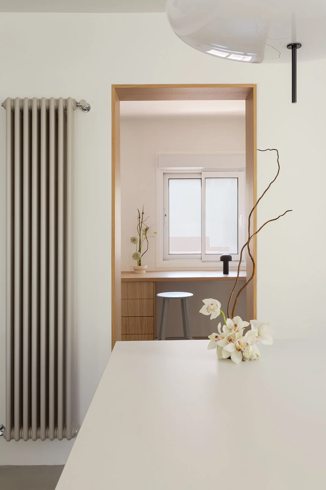 Enmarcamos y diferenciamos una entrada de acceso a la vivienda, y creamos una estancia completamente diáfana de salón-comedor con cocina integrada. Para dejar al otro lado del muro el dormitorio, una amplia zona de trabajo y el baño, y aprovechamos los huecos de paso originales, para conectar las estancias, potenciando la sensación de amplitud y luminosidad que realmente escondía la vivienda.