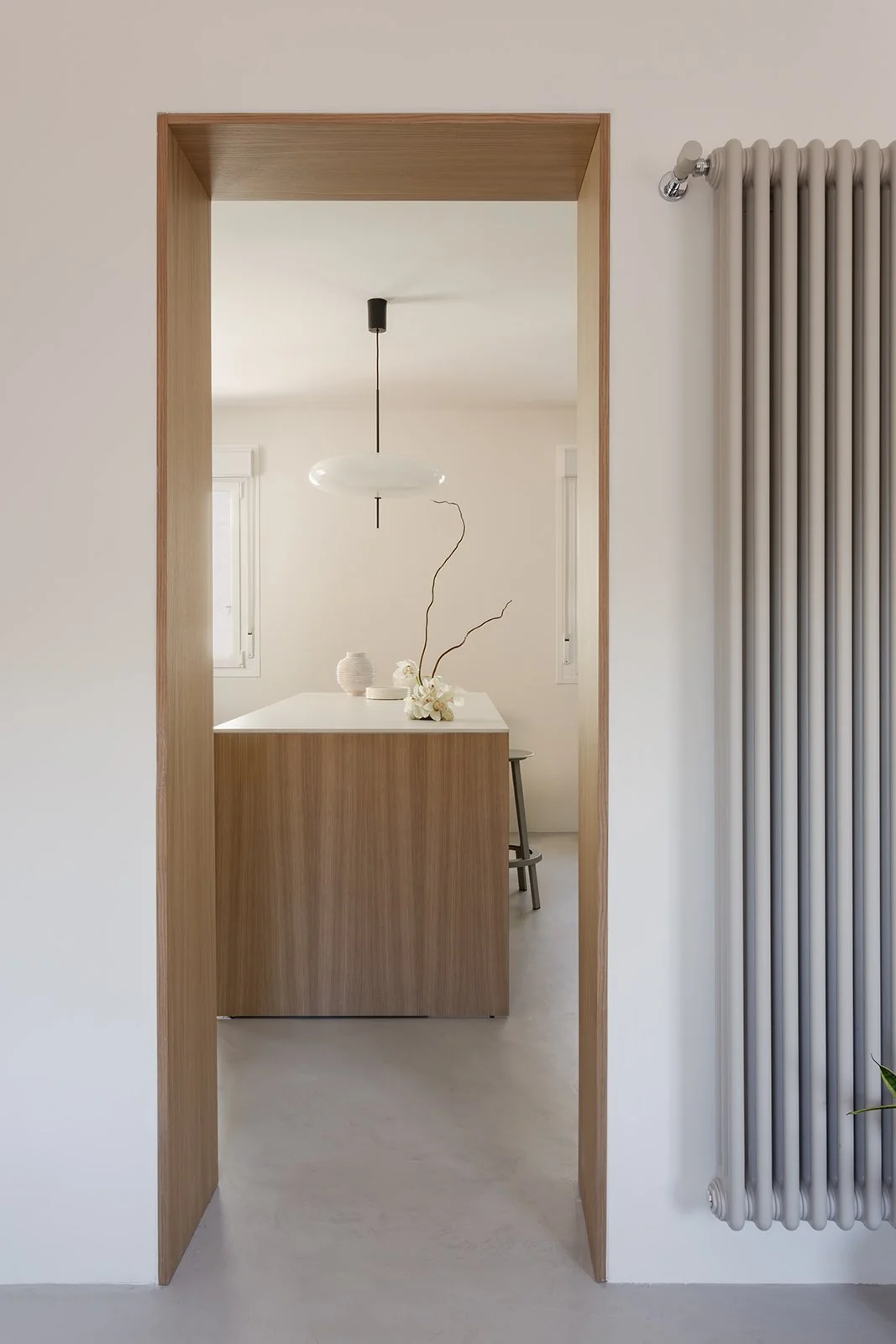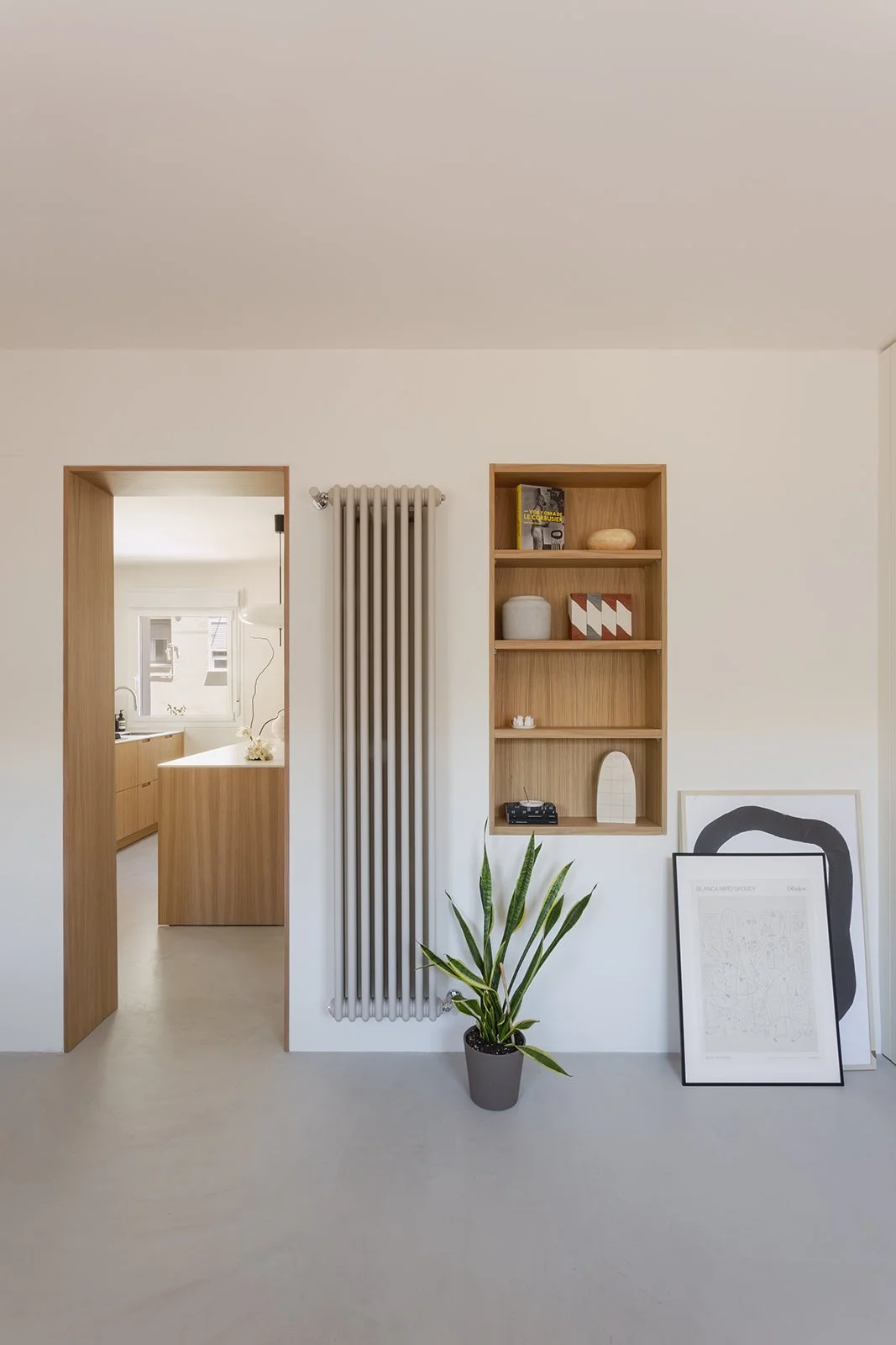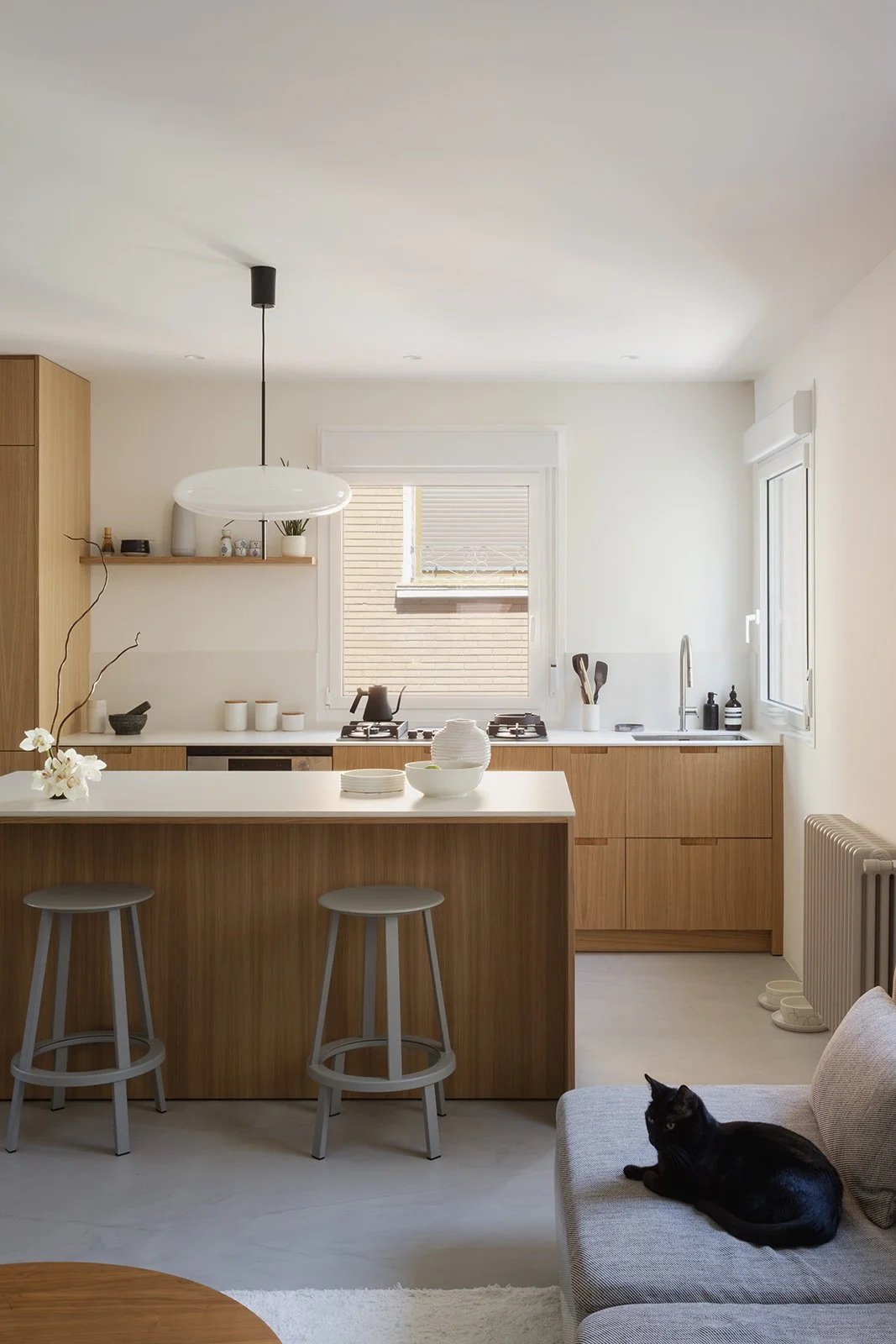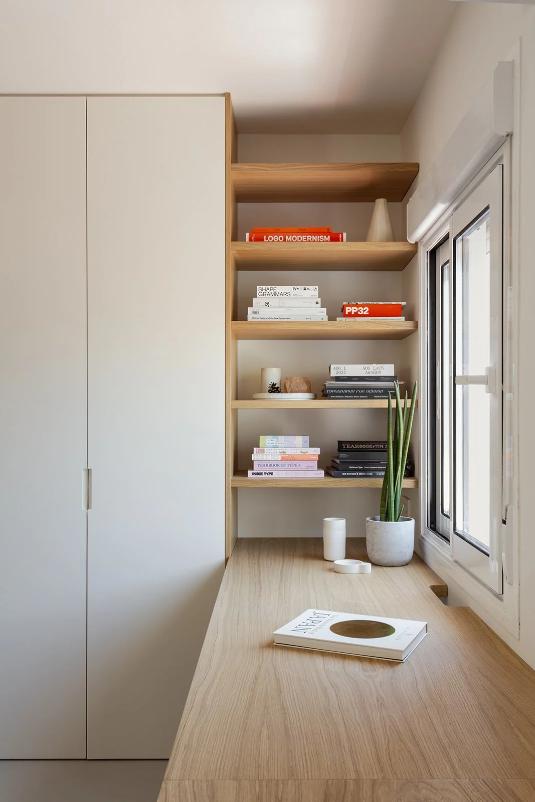 Enmarcamos y diferenciamos una entrada de acceso a la vivienda, y creamos una estancia completamente diáfana de salón-comedor con cocina integrada. Para dejar al otro lado del muro el dormitorio, una amplia zona de trabajo y el baño, y aprovechamos los huecos de paso originales, para conectar las estancias, potenciando la sensación de amplitud y luminosidad que realmente escondía la vivienda.