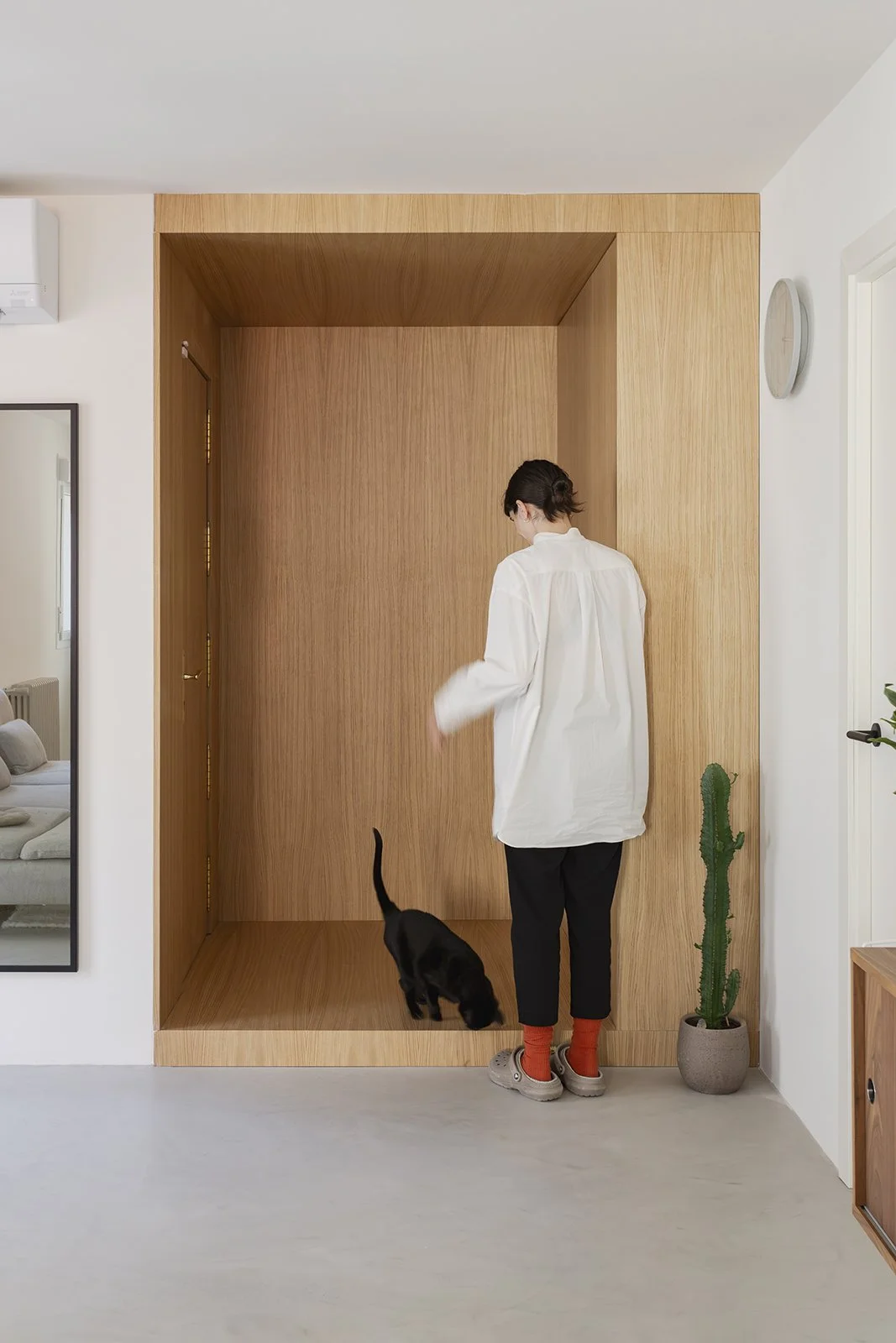 Al umbral de entrada o GENKAN, un rincón pensado para quitarse los zapatos y separarnos de la vida exterior, le asignamos la madera, más calida.