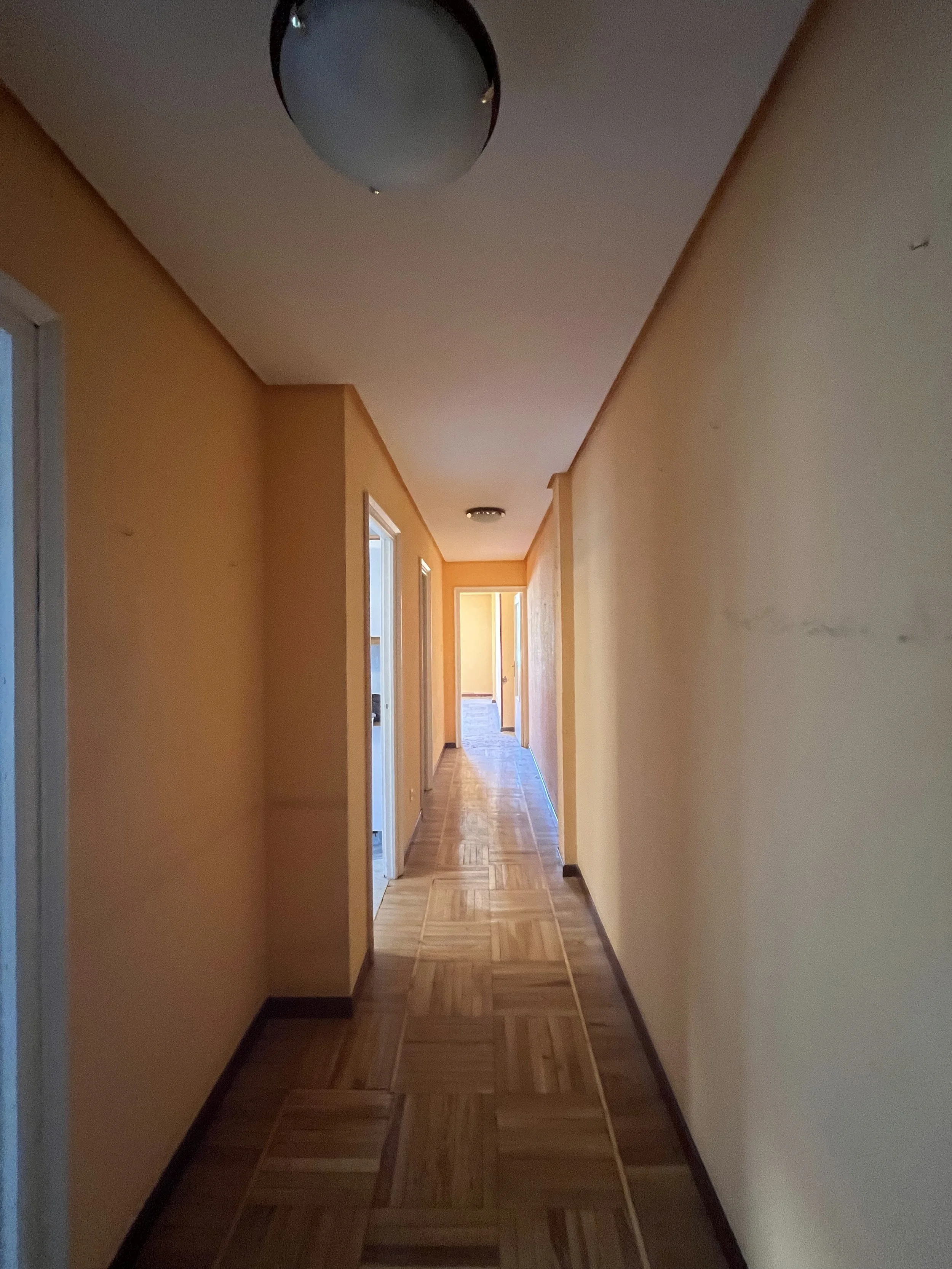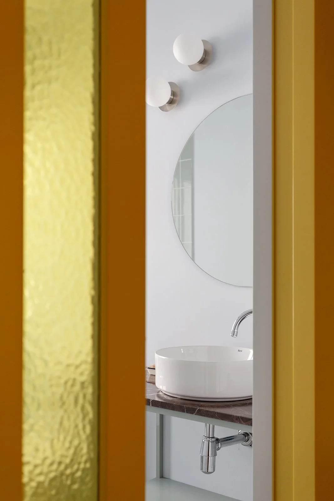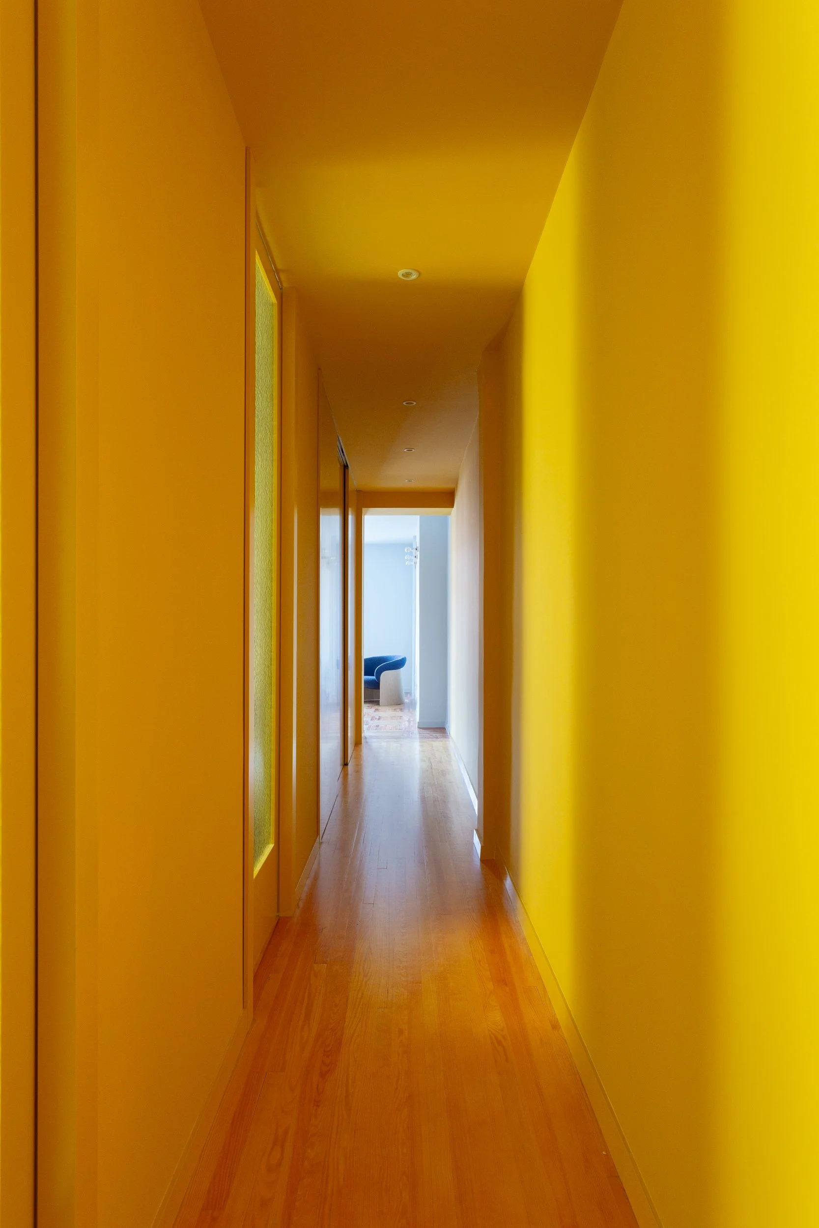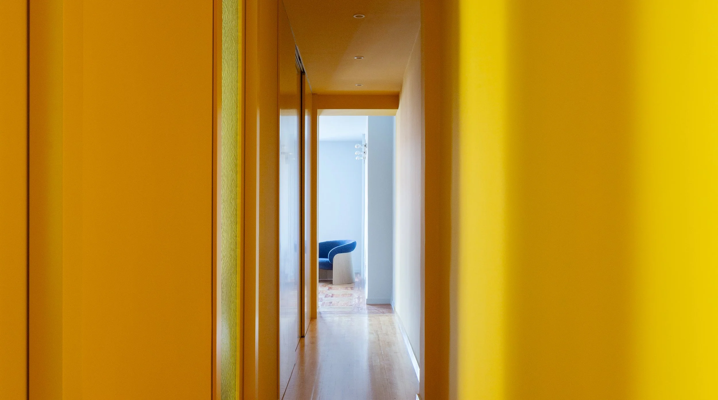 El pasillo amarillo, con puertas de vidrio del mismo color que permite que la luz invada el espacio a lo largo del día, acortando visualmente la distancia del mismo.