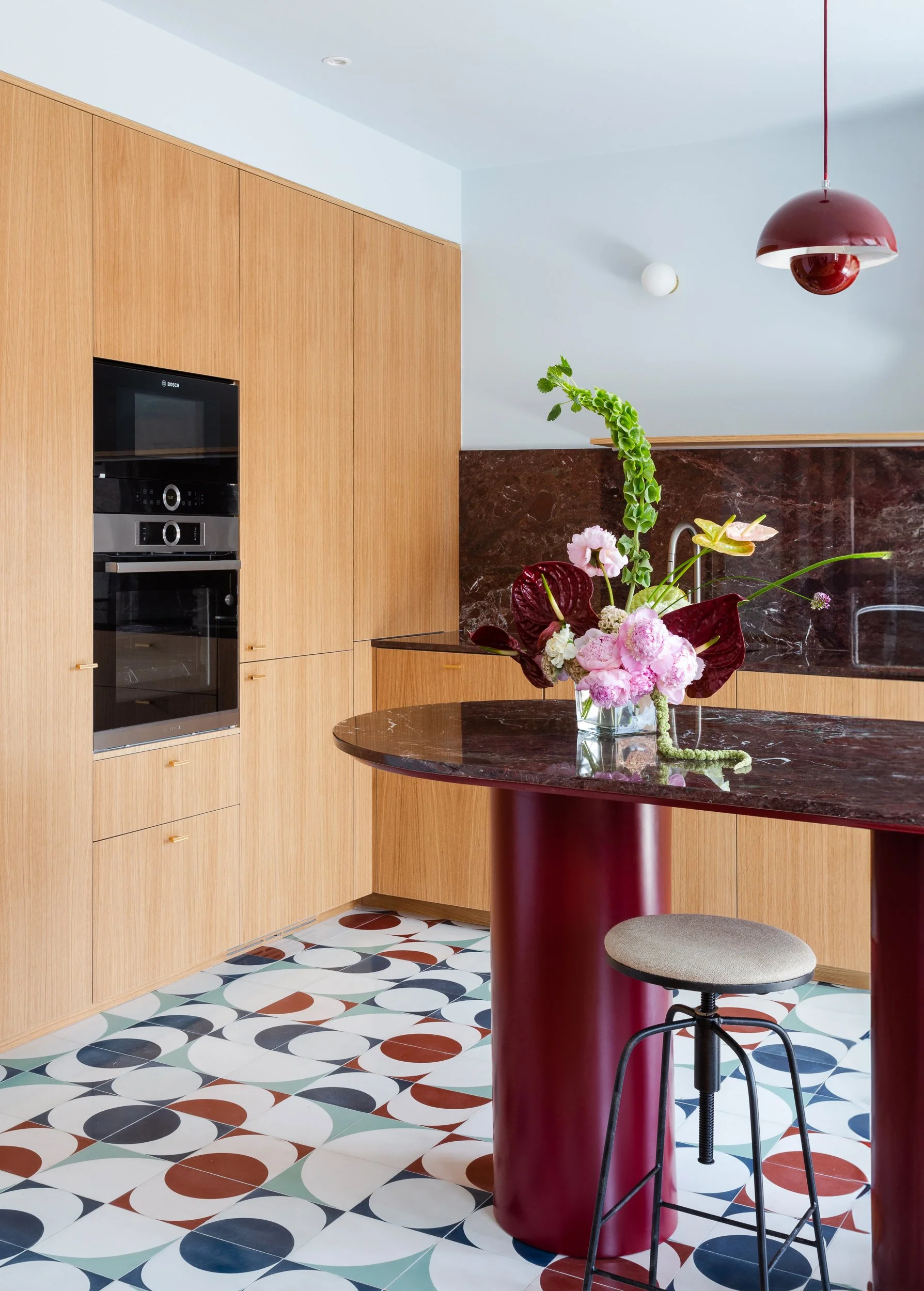 Y la guinda del pastel es este salón, donde el burdeos es el absoluto protagonista: a través de estos nichos alicatados en las paredes, el rotundo volumen que marca la campana de la cocina y esta fabulosa encimera de mármol Rosso Lepanto que conquista la isla central, la encimera y el frontal de la cocina, dialogando con los muebles de madera de roble con tiradores dorados.