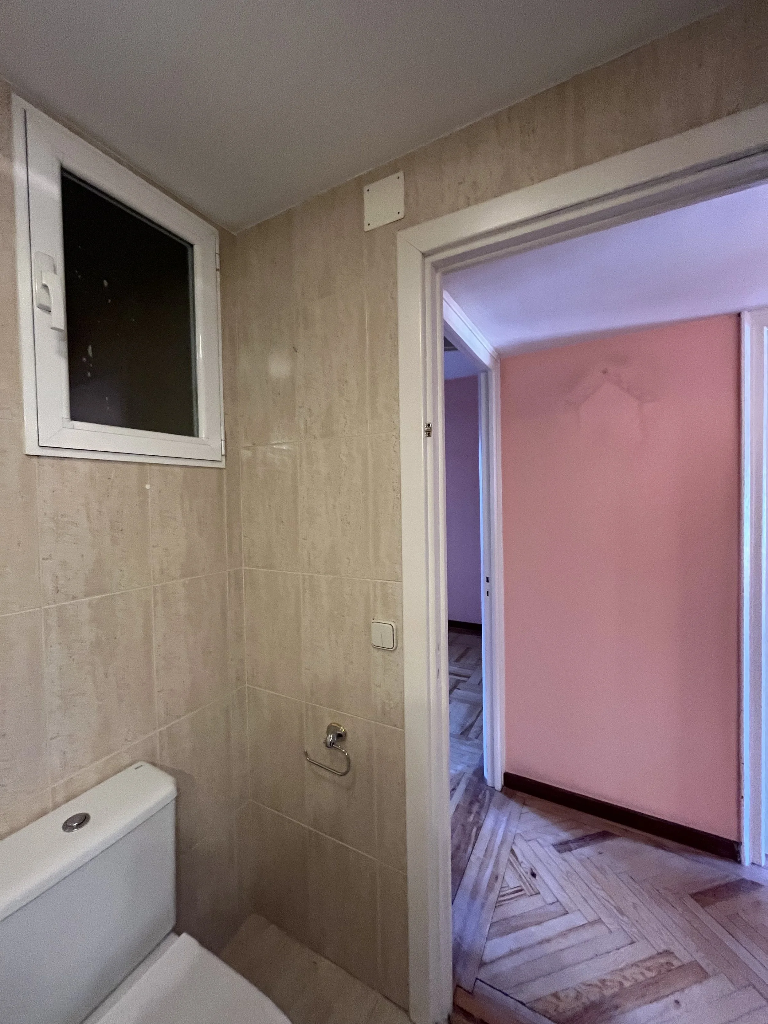 El baño de invitados, con verde agua en paredes y suelo, contrastando con la encimera de mármol que también estará presente en toda la vivienda. La luz amarilla del pasillo se adueña del espacio a través de la puerta de vidrio.