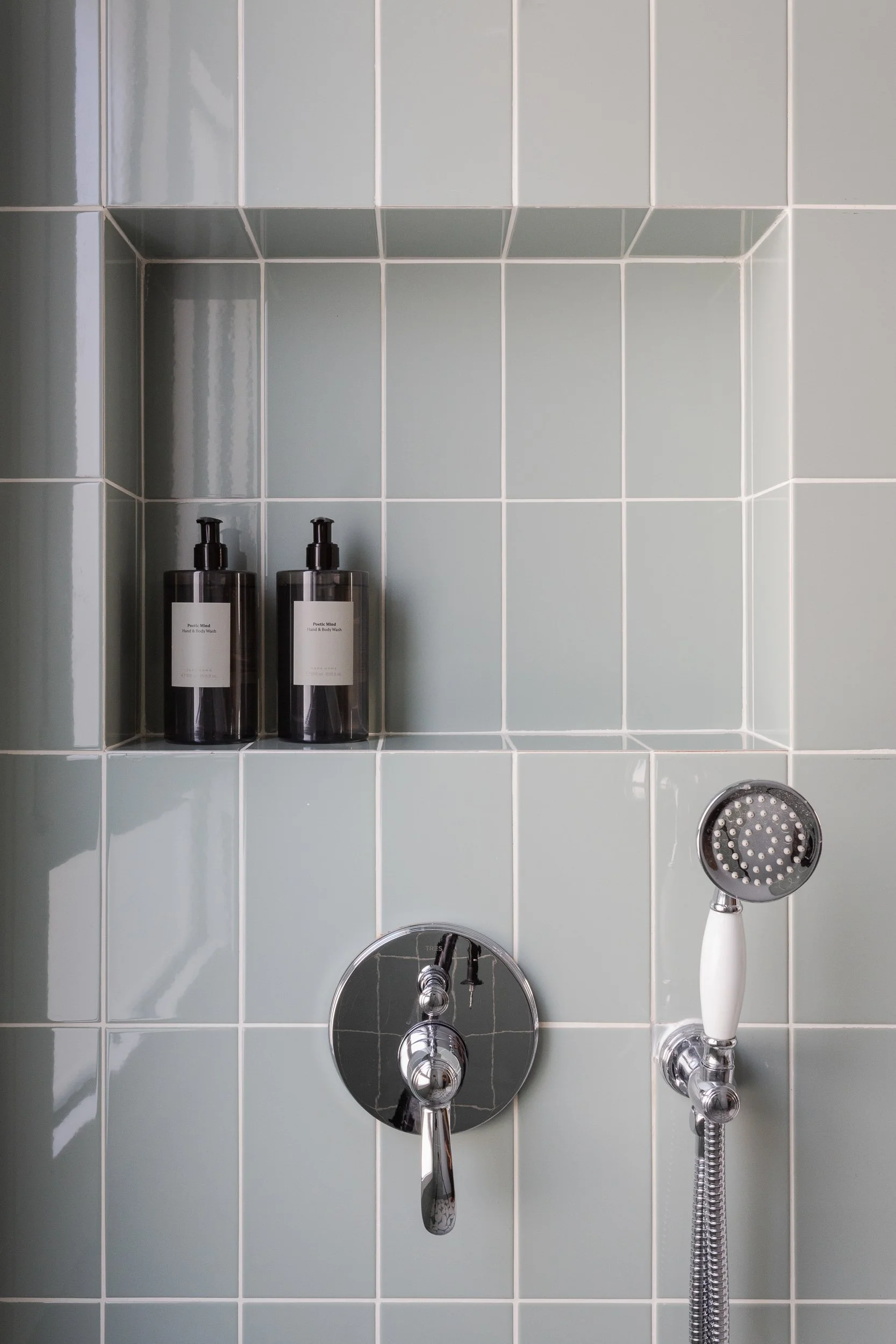 Reservamos el azul marino para el dormitorio principal y el baño en suite. Donde aplicamos en este caso el alicatado para diseñar un fabuloso cabecero de obra, el vestidor en L de nuevo recubierto de espejos nos da paso al baño donde nos encontramos los mismos materiales en esta tonalidad.