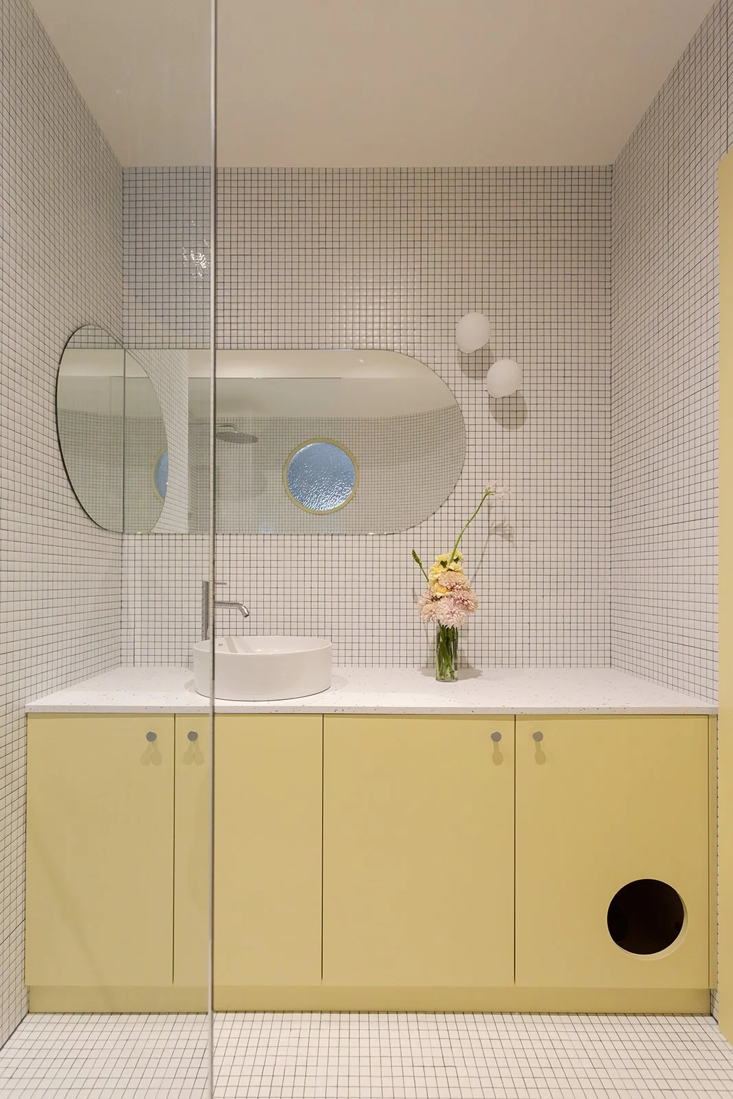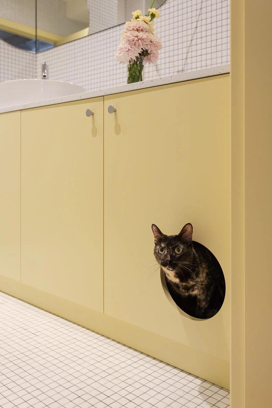 El mueble del lavabo, de pared a pared, maximiza el almacenaje y esconde discretamente el arenero de la gata, manteniendo el espacio ordenado y limpio.
