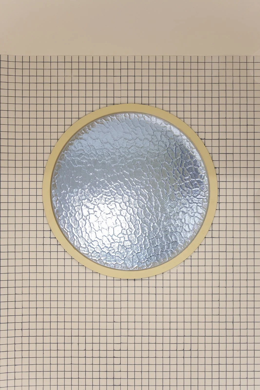 El baño de Casa Paloma destaca por su funcionalidad y elegancia. La ventana circular aporta luz natural, y los azulejos blancos con borada azul crean un toque moderno.