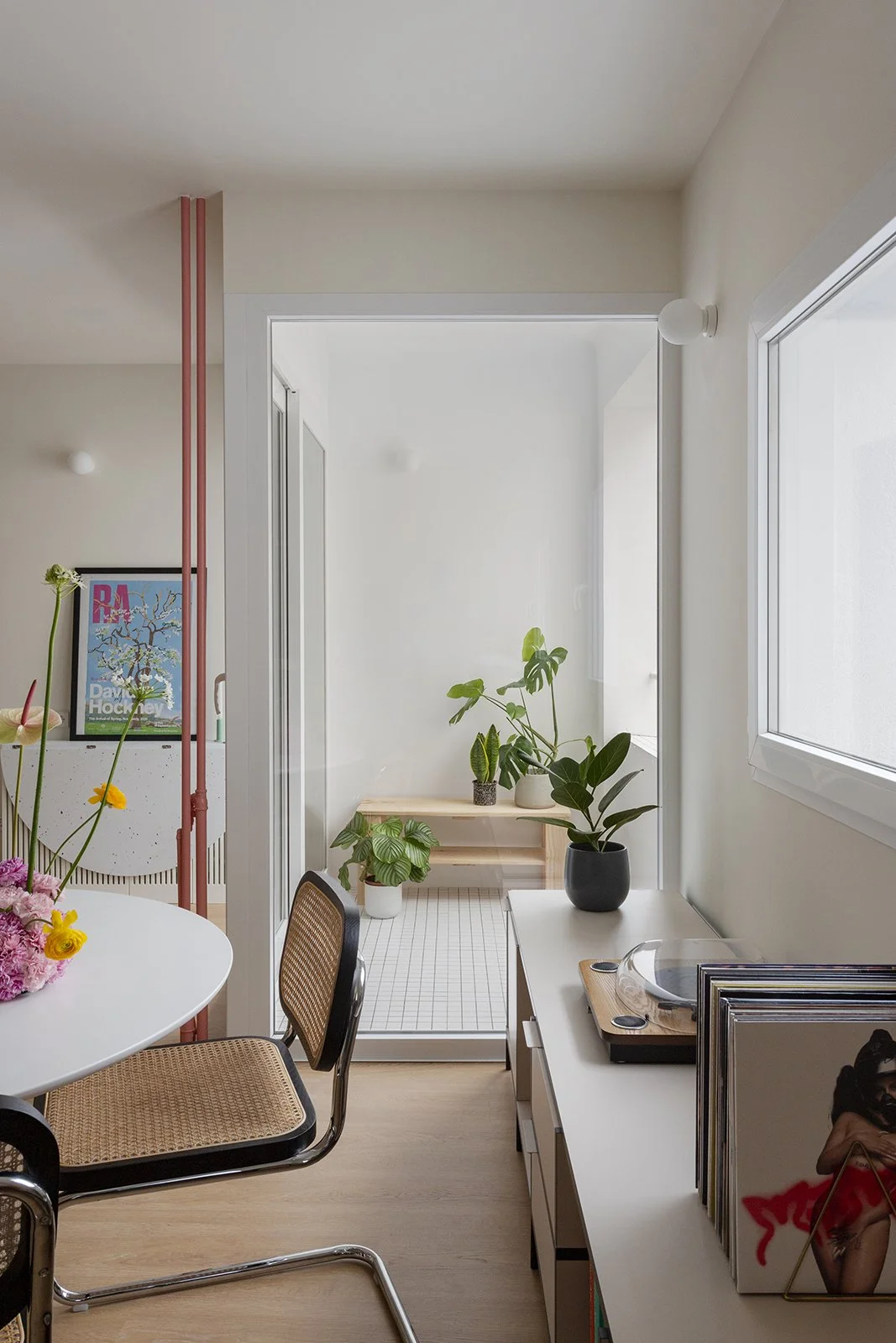 En pisos pequeños, la carpintería a medida es esencial. Diseñamos cada elemento de Casa Paloma para optimizar el espacio. El mueble de la entrada tiene baldas curvas que suavizan la transición al salón. El armario del dormitorio incluye baldas inferiores que funcionan como mesitas de noche, liberando espacio.