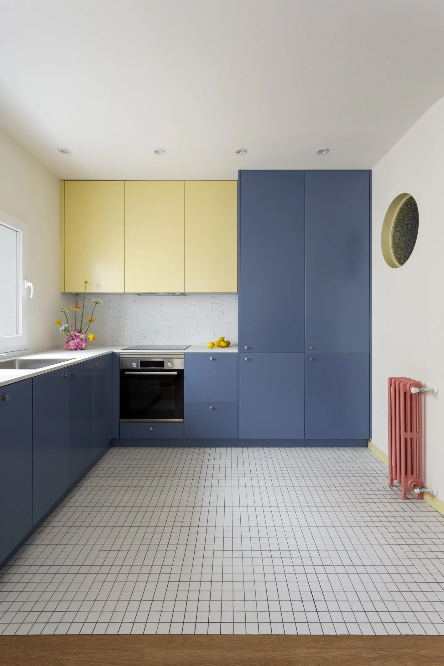 La cocina de Casa Paloma combina sostenibilidad y estilo con maestría. Para los muebles, elegimos colores pastel como azul y amarillo, creando un ambiente fresco y acogedor que se extiende a puertas y rodapiés.