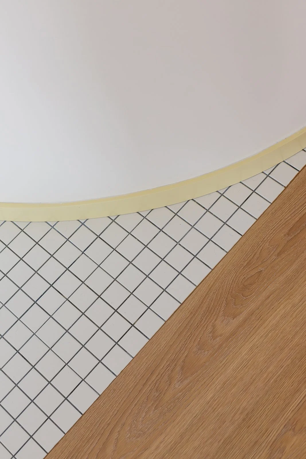 Detalles como los tubos de calefacción y radiadores en rosa salmón rompen con el predominante blanco de las paredes, añadiendo un toque llamativo y único. Además, utilizamos azulejos blancos con borada azul en diferentes formatos, lo que no solo ilumina el espacio, sino que también aporta una textura interesante y moderna.
