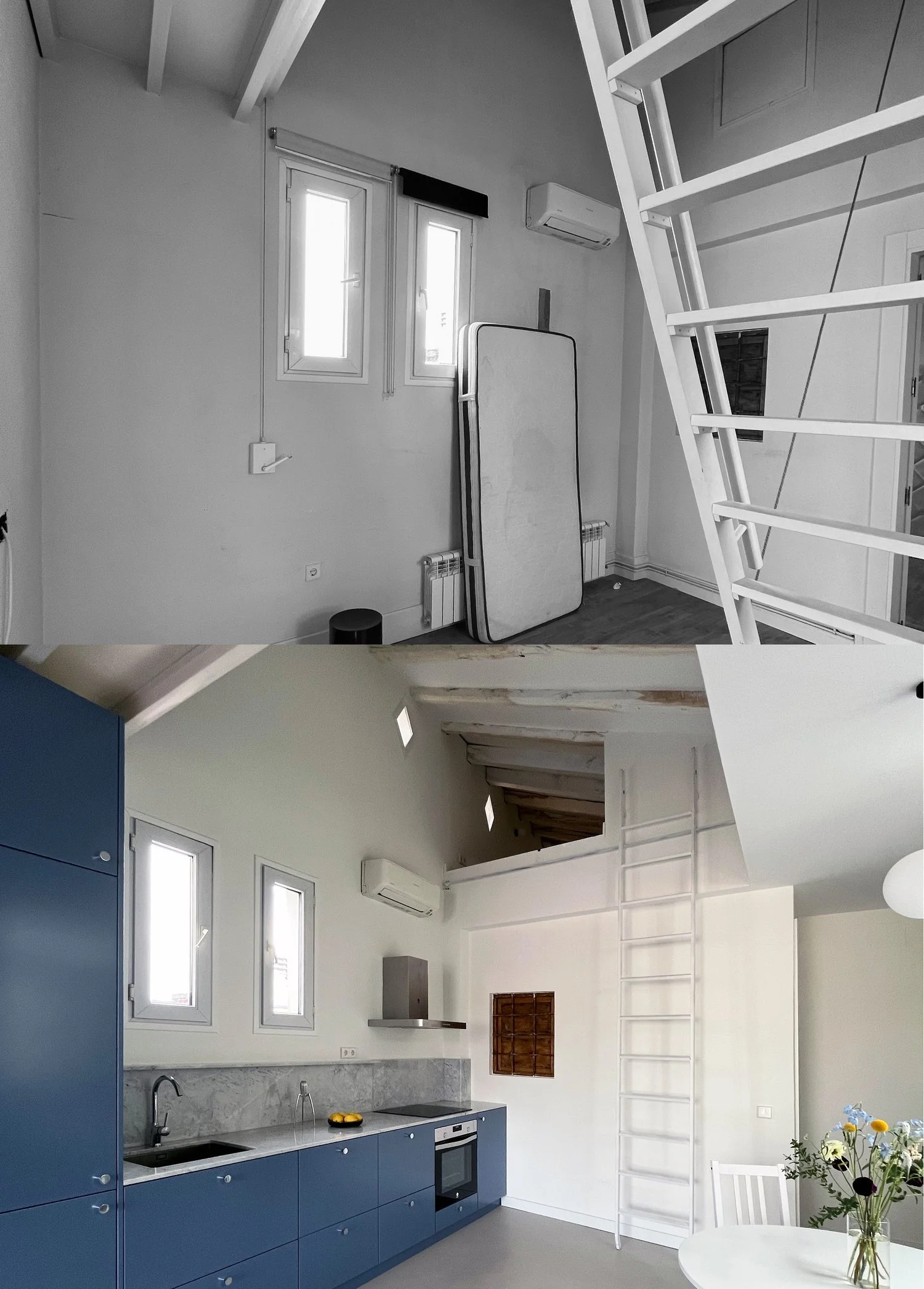 Un estudio de 36 m2 en Huertas con mucho encanto, que con una reforma puntual (cambiando cocina, baño y pintura) se llenó de luz. En 5 meses pudo disfrutar de este increíble loft.